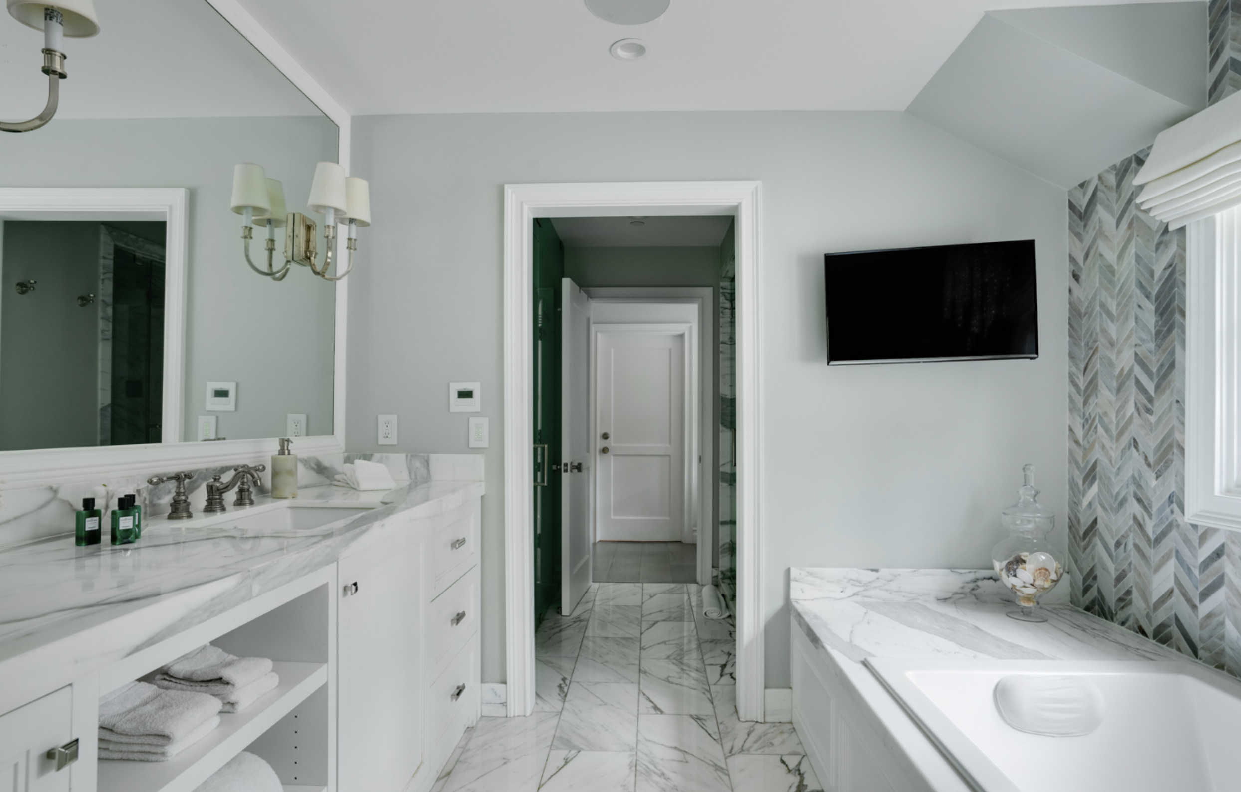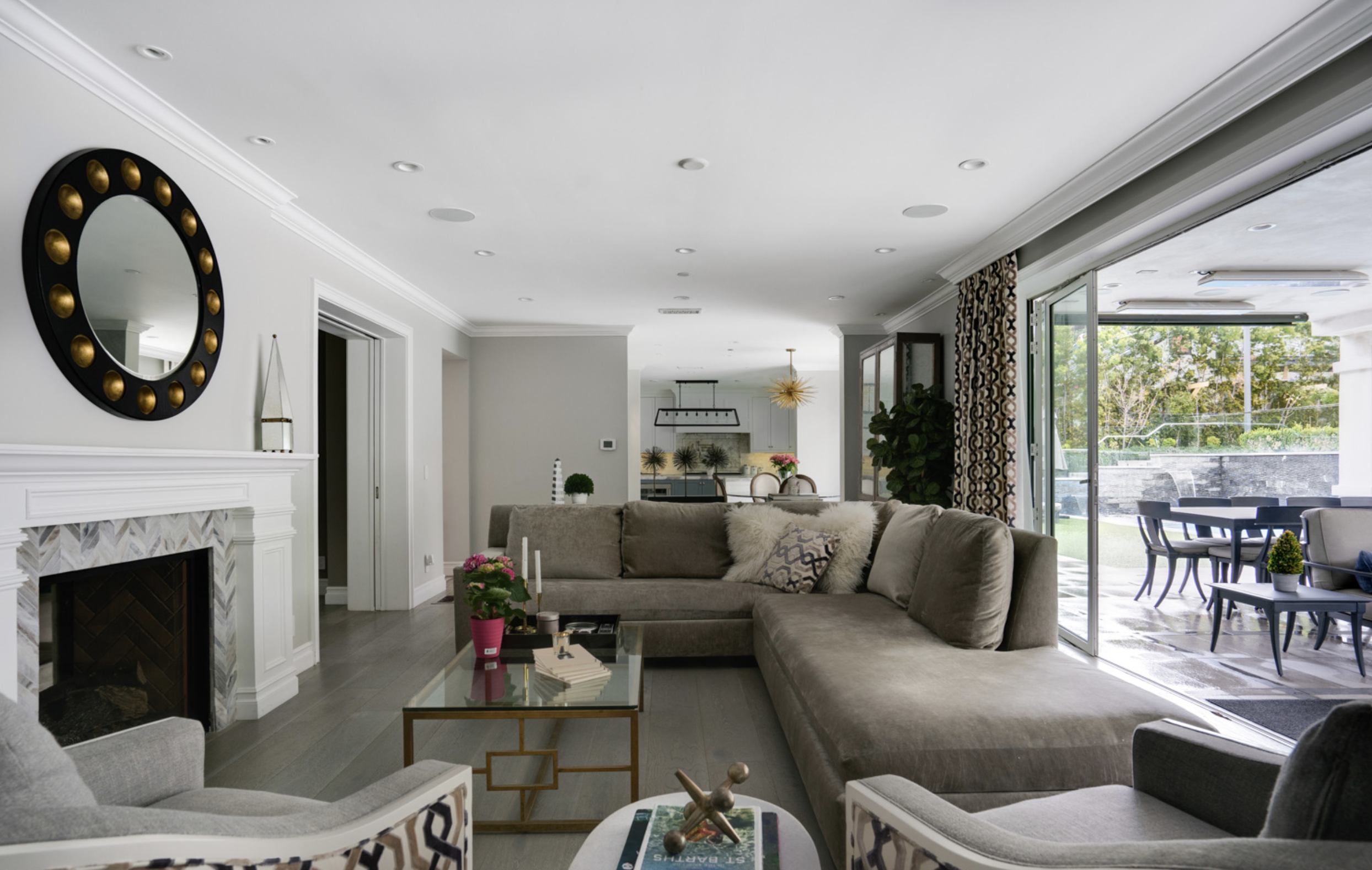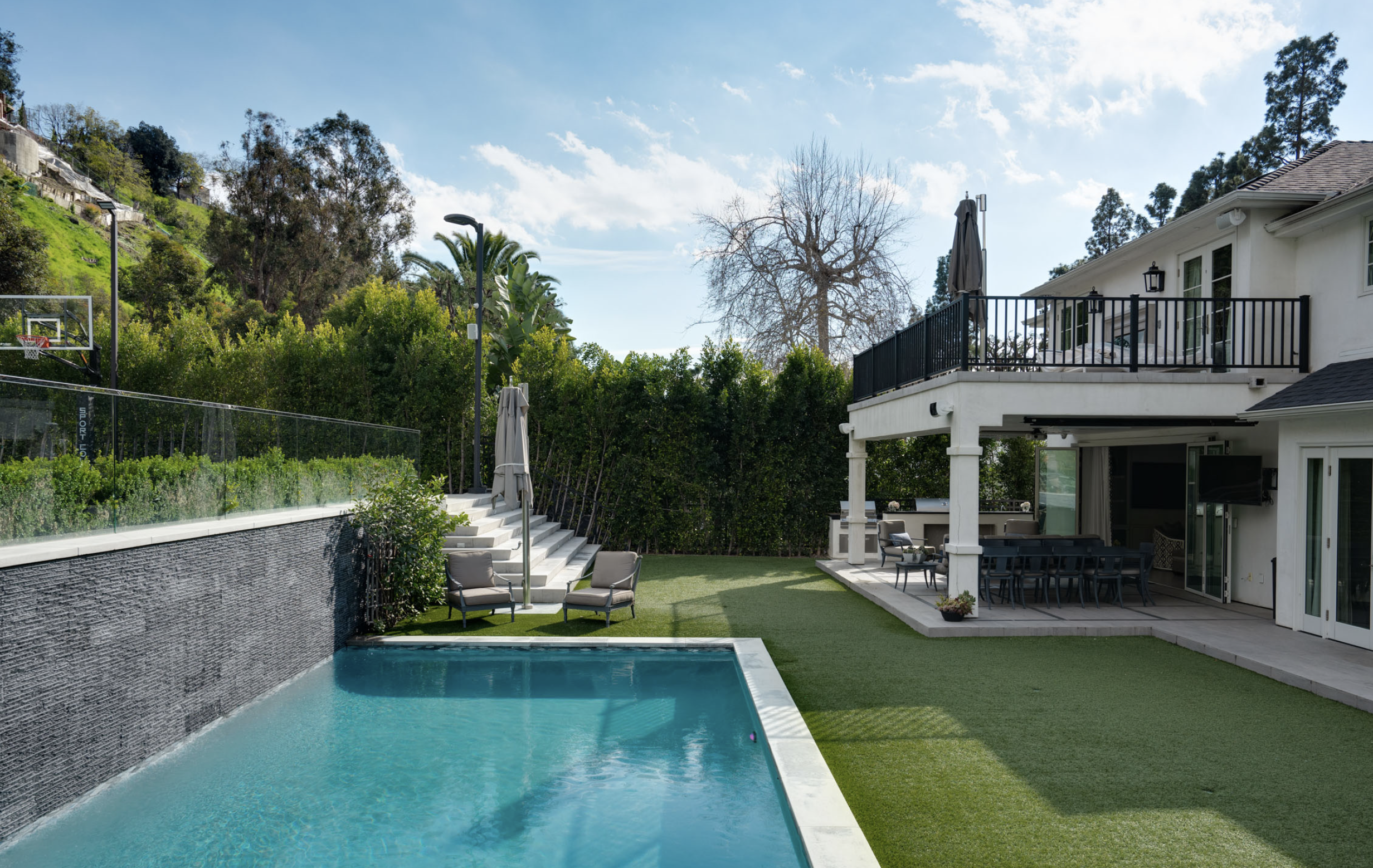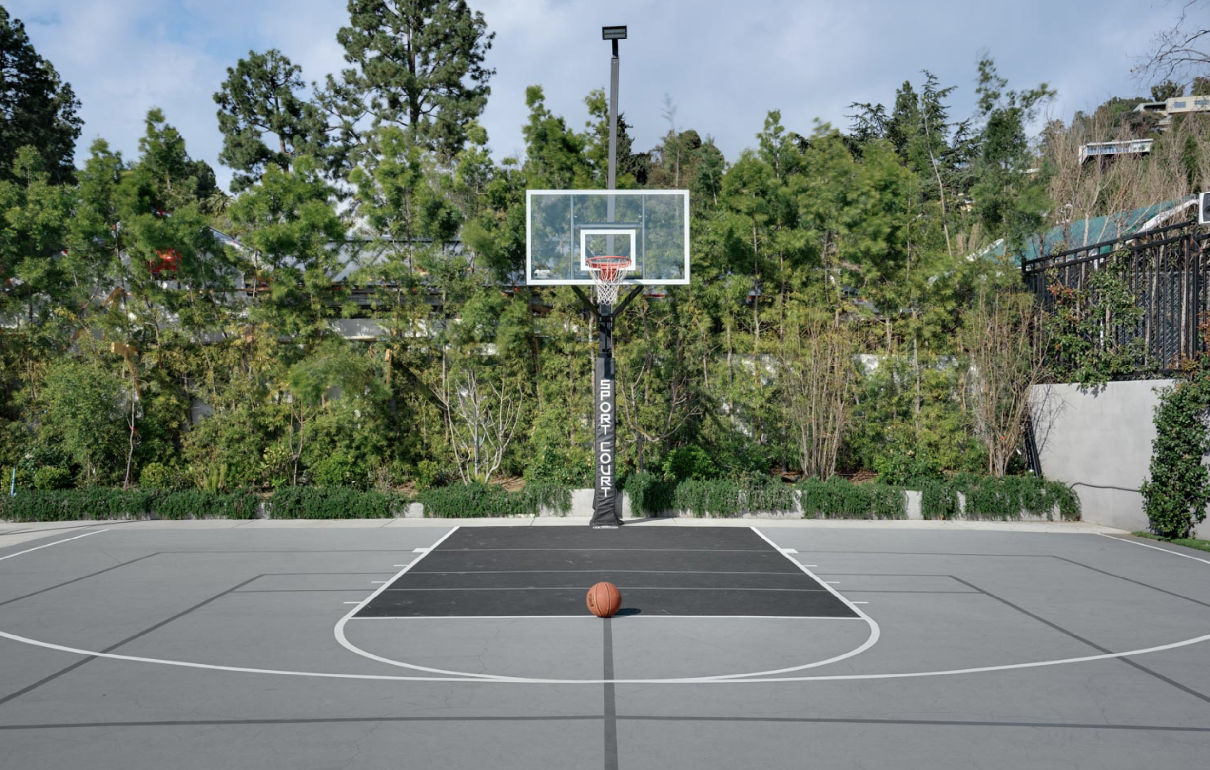 Set behind a large motor court on an expansive private lot, this fully furnished Paul Williams-style residence is a rare Beverly Hills retreat designed for effortless entertaining. The gracious main level unfolds through a formal living room with a fireplace and light-filled bay window, a formal dining room, and a secondary living room featuring a fireplace, custom built-ins, and disappearing glass doors that open directly to the outdoor living areas - creating a coveted indoor-outdoor flow. The marble-clad kitchen is outfitted with stainless steel appliances, including a Wolf range, and opens to a breakfast area, while a spiral staircase leads to the second level. Upstairs, the luxurious primary suite offers vaulted ceilings, a private balcony, and a spa-like en suite bath, complemented by well-appointed guest rooms throughout the home. Thoughtfully designer-decorated, the property includes five bedrooms and four-and-a-half baths, plus a fully detached one-bedroom guest house of approximately 700 square feet with its own kitchen. The resort-style grounds feature a full-size basketball court, pickleball court, pool, and direct private access to nearby hiking trails, all just moments from the best of Beverly Hills shopping, dining, and entertainment.