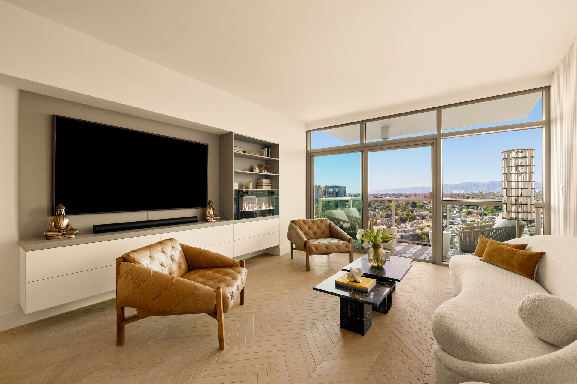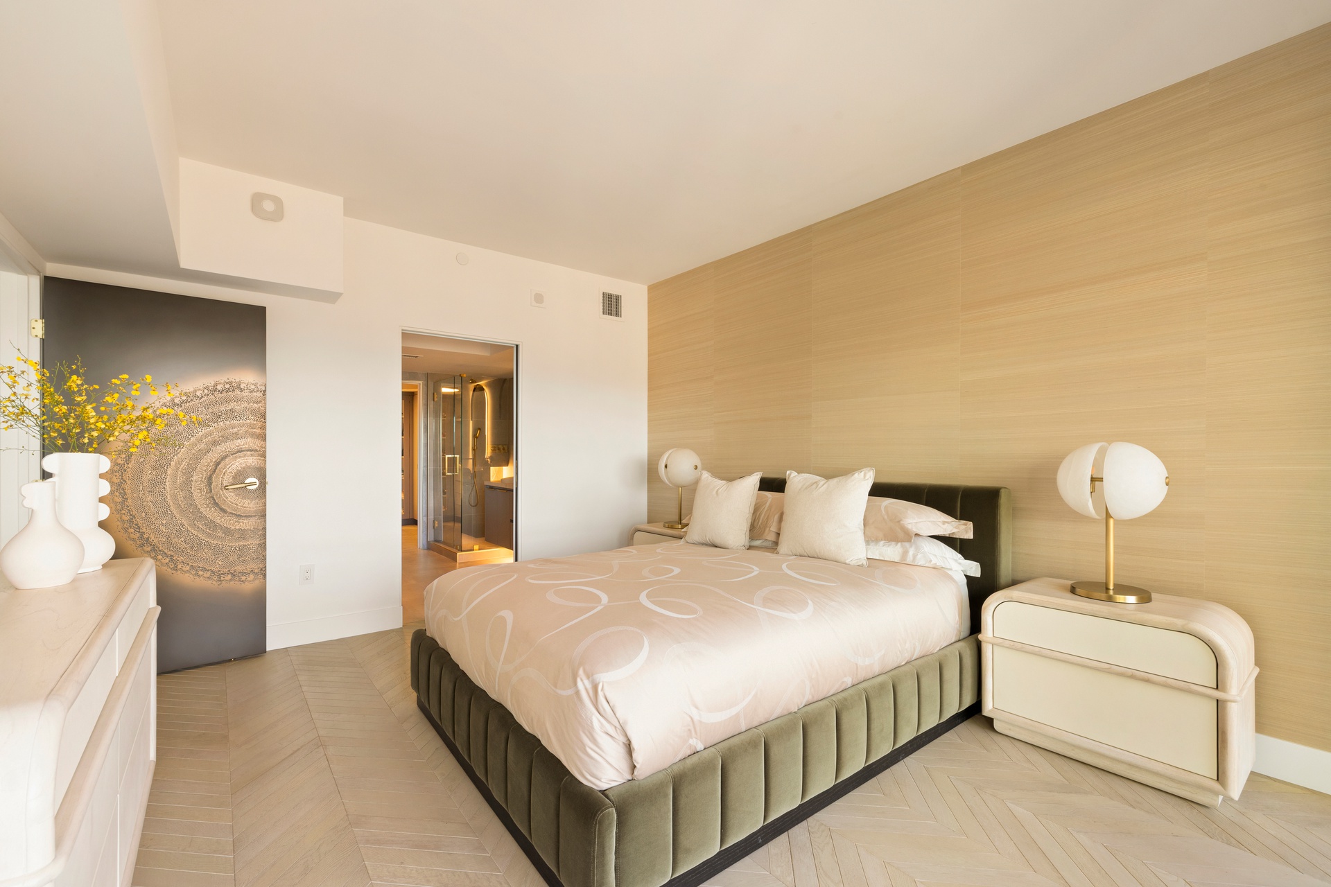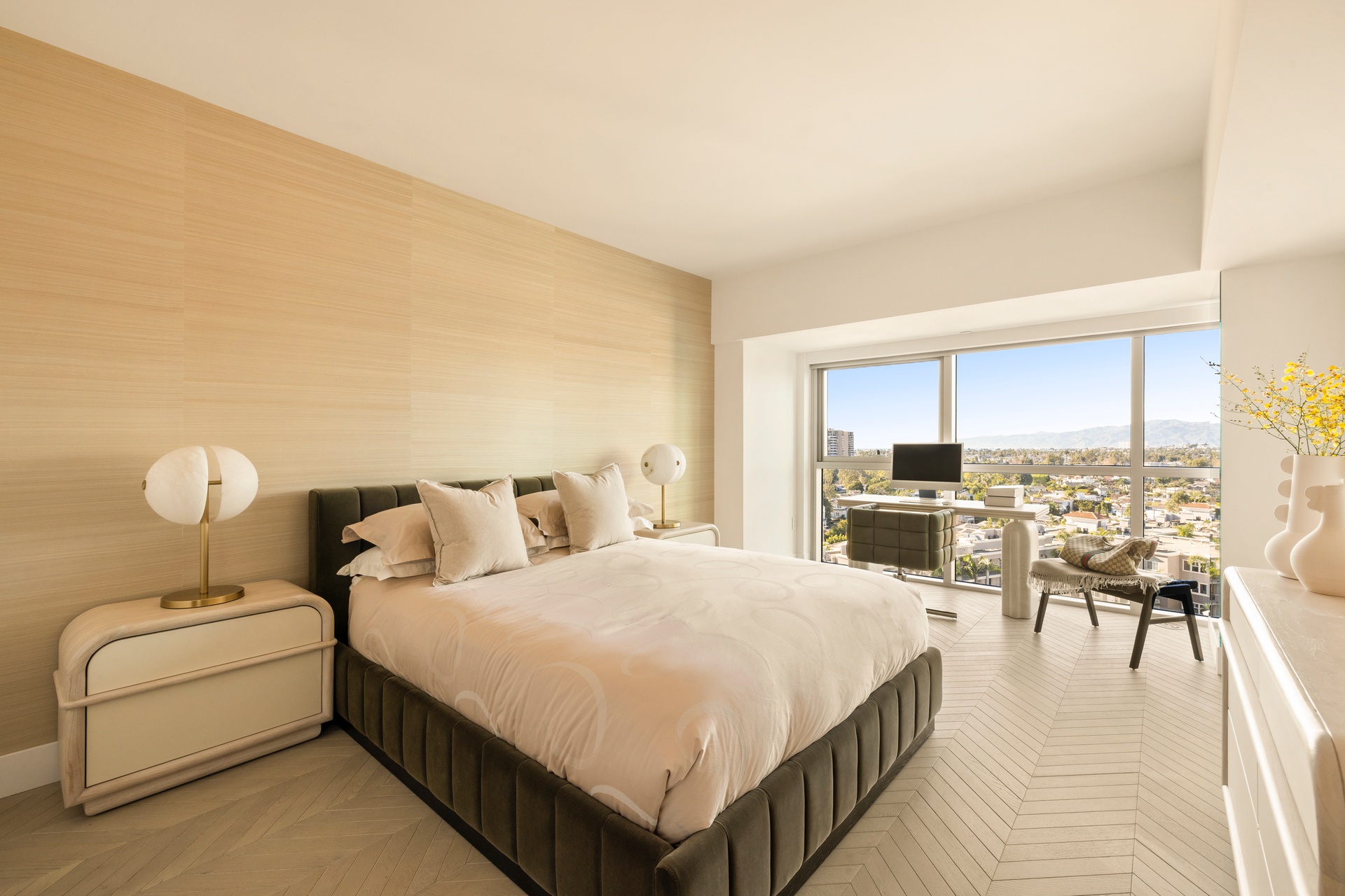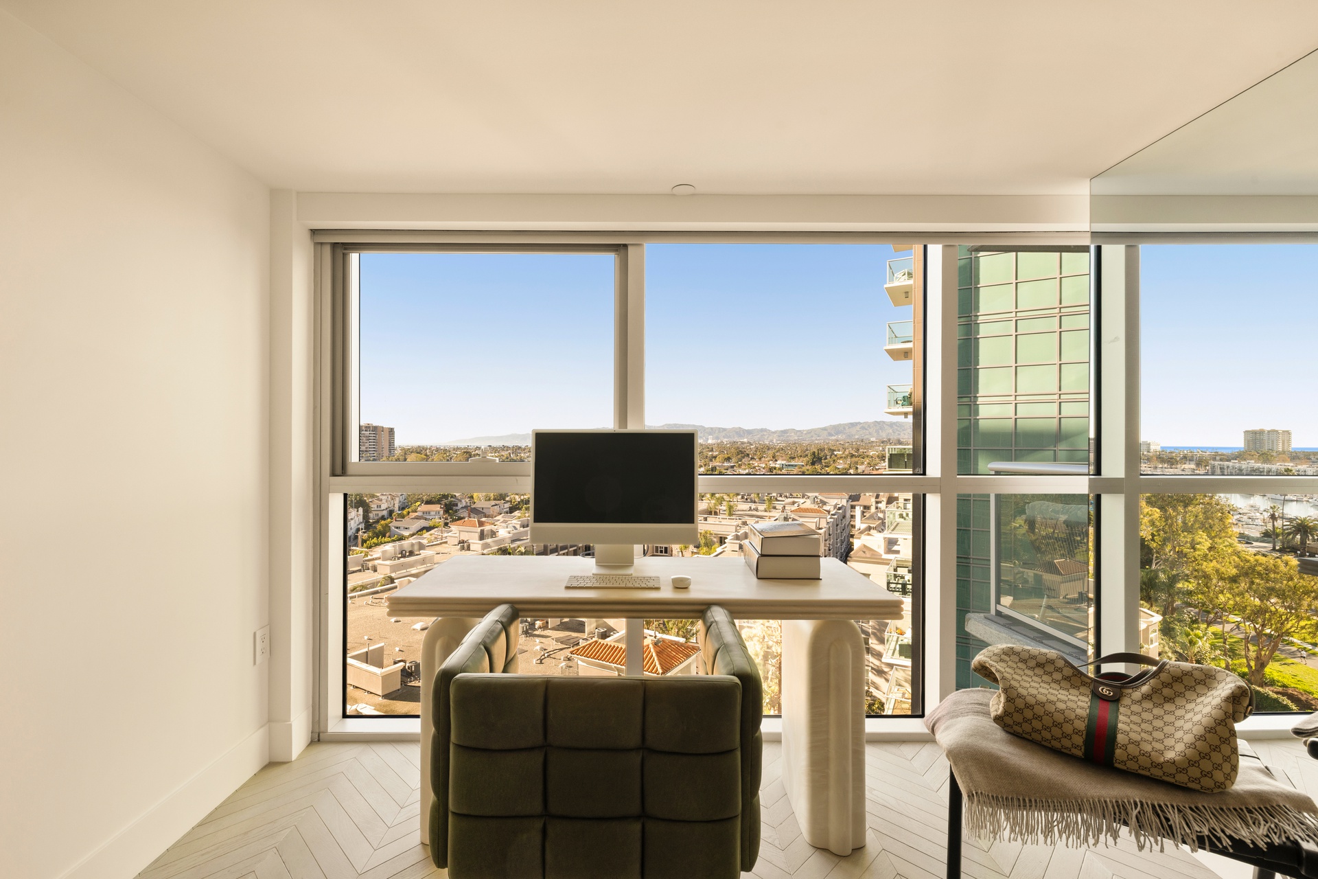 Impeccably designed and perched on the tenth floor of the exclusive Azzurra, this 2-bedroom, 2.5-bath residence showcases breathtaking views of the Marina and Santa Monica Mountains from every room. The interiors are defined by chevron Zanzibar European oak flooring, custom Liquid Metal doors with bespoke pulls, and curated finishes throughout. Luxe Phillip Jeffries wallcoverings in silk, linen, and vinyl snakeskin add depth and texture, while Lutron electronic shades and outlets provide effortless modern convenience. The sleek kitchen is outfitted with Dacor luxury appliances and a custom microwave drawer oven, flowing seamlessly into a spacious dining area highlighted by a custom alabaster and leather chandelier, a built-in bar, and an integrated Miele wine cooler - perfect for entertaining. The sun-filled living room features custom built-ins, an electric fireplace, and statement lighting, with glass doors opening to a private balcony for a seamless indoor-outdoor experience. A refined powder room completes the main living spaces. The serene primary suite offers space for a dedicated office nook overlooking the views and a hotel-style en-suite bath with a dual-sink vanity, glass-enclosed shower, soaking tub, and boutique-like closet. An equally sophisticated guest suite, in-unit laundry, and meticulous attention to detail throughout complete the home. Residents of Azzurra enjoy full-service, hotel-style living with 24/7 concierge, a resort-style pool and spa, a state-of-the-art indoor/outdoor fitness center, and an exceptional collection of amenities - all set in a premier Westside location.