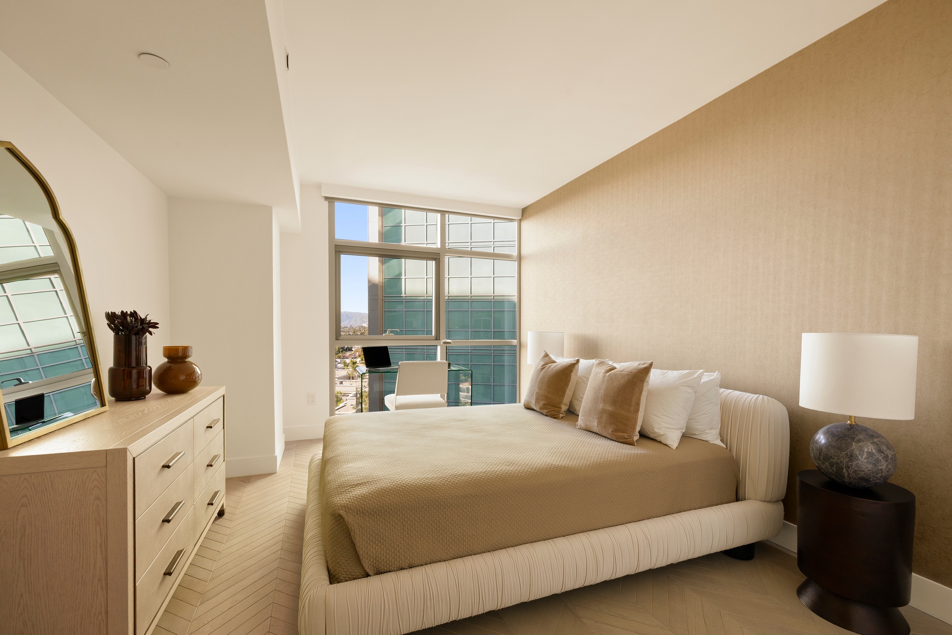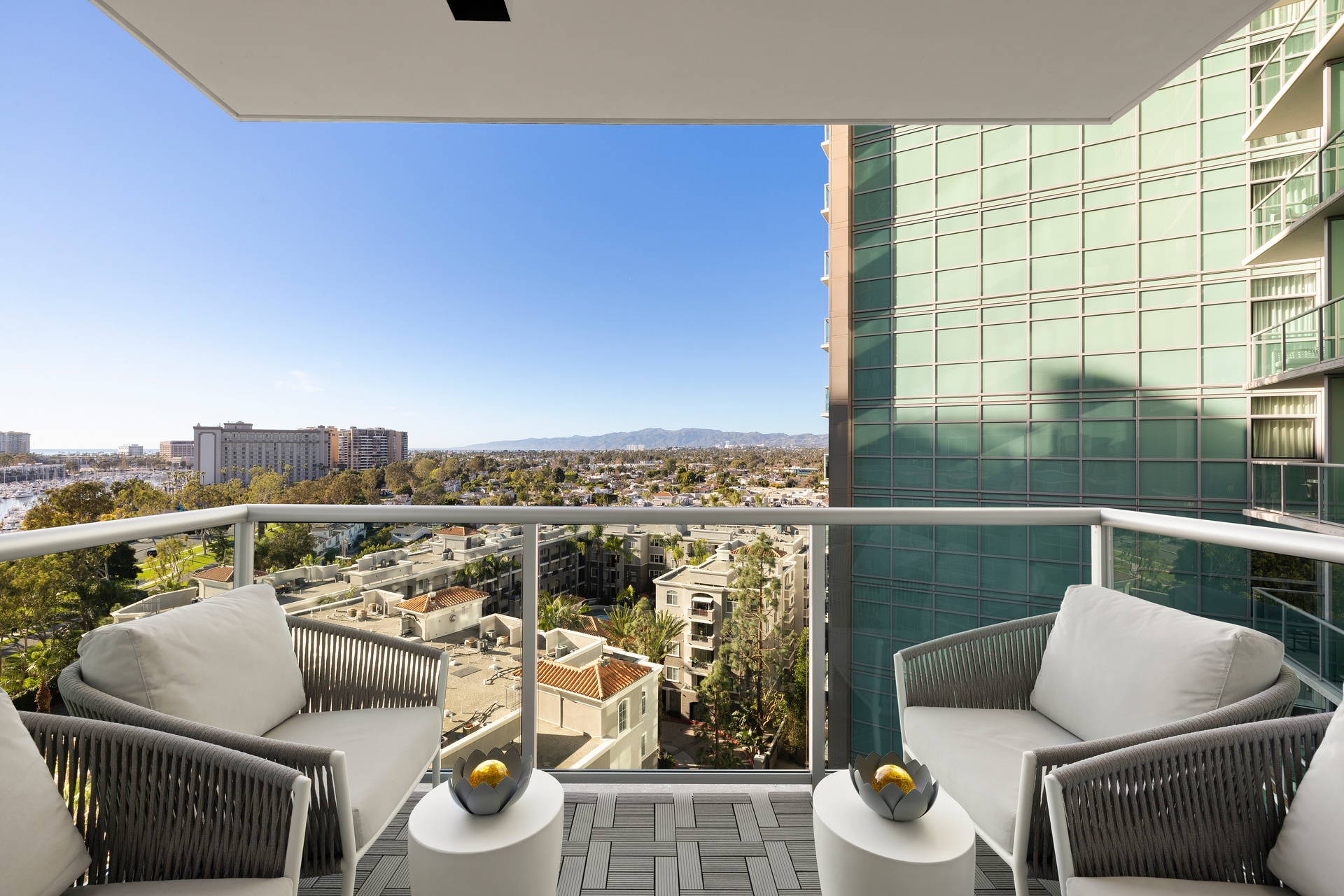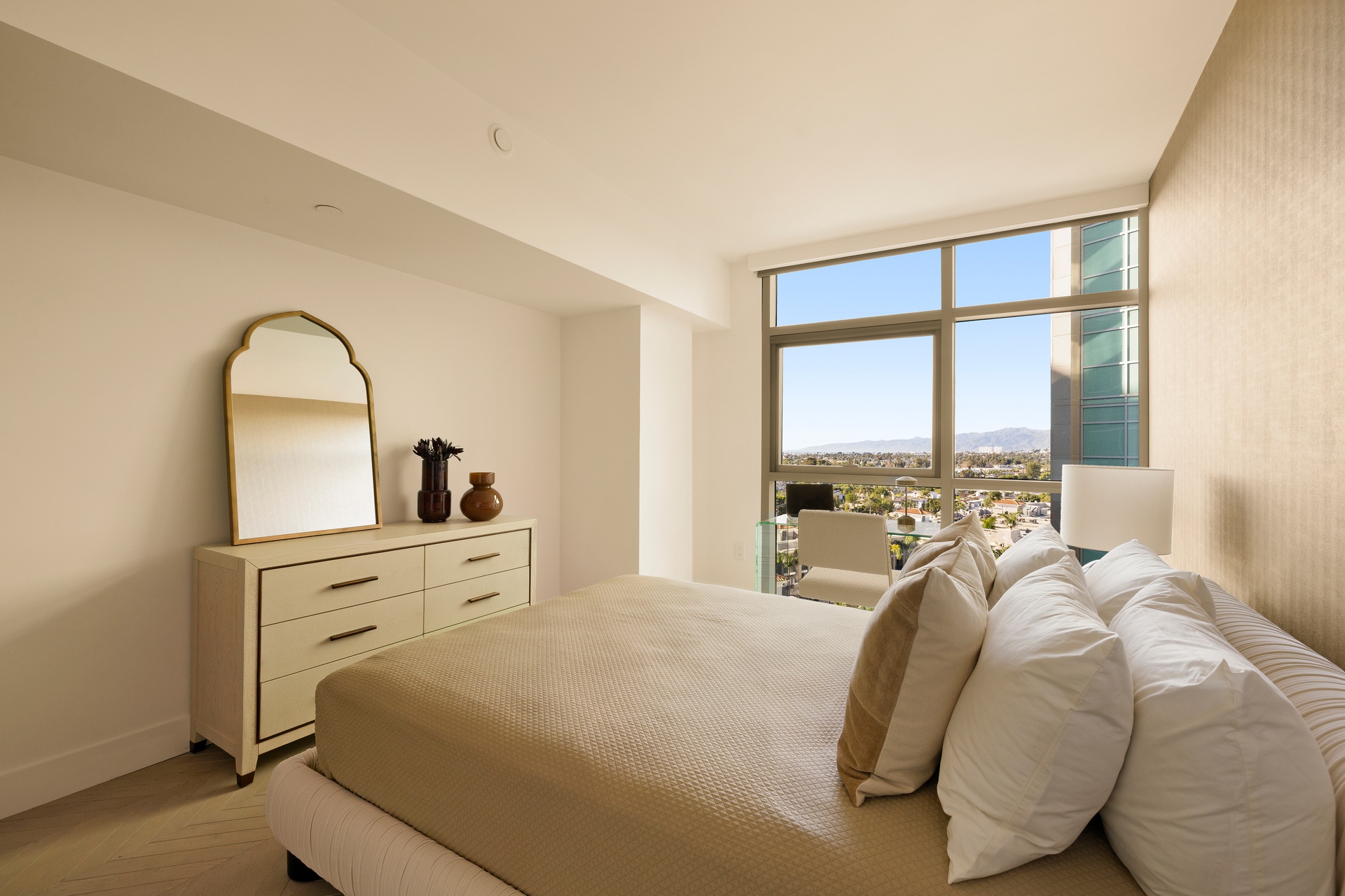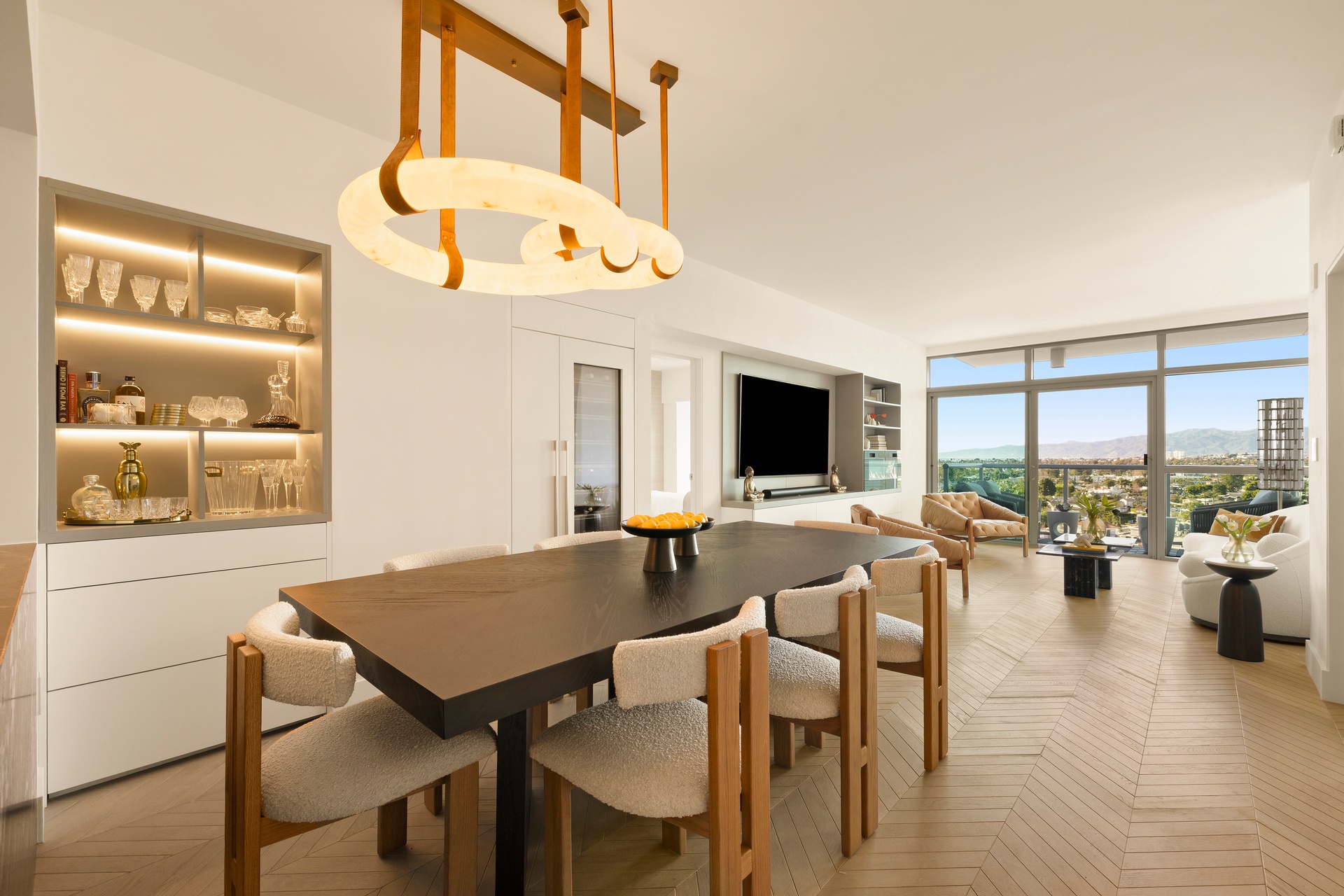 Impeccably designed and perched on the tenth floor of the exclusive Azzurra, this 2-bedroom, 2.5-bath residence showcases breathtaking views of the Marina and Santa Monica Mountains from every room. The interiors are defined by chevron Zanzibar European oak flooring, custom Liquid Metal doors with bespoke pulls, and curated finishes throughout. Luxe Phillip Jeffries wallcoverings in silk, linen, and vinyl snakeskin add depth and texture, while Lutron electronic shades and outlets provide effortless modern convenience. The sleek kitchen is outfitted with Dacor luxury appliances and a custom microwave drawer oven, flowing seamlessly into a spacious dining area highlighted by a custom alabaster and leather chandelier, a built-in bar, and an integrated Miele wine cooler - perfect for entertaining. The sun-filled living room features custom built-ins, an electric fireplace, and statement lighting, with glass doors opening to a private balcony for a seamless indoor-outdoor experience. A refined powder room completes the main living spaces. The serene primary suite offers space for a dedicated office nook overlooking the views and a hotel-style en-suite bath with a dual-sink vanity, glass-enclosed shower, soaking tub, and boutique-like closet. An equally sophisticated guest suite, in-unit laundry, and meticulous attention to detail throughout complete the home. Residents of Azzurra enjoy full-service, hotel-style living with 24/7 concierge, a resort-style pool and spa, a state-of-the-art indoor/outdoor fitness center, and an exceptional collection of amenities - all set in a premier Westside location.