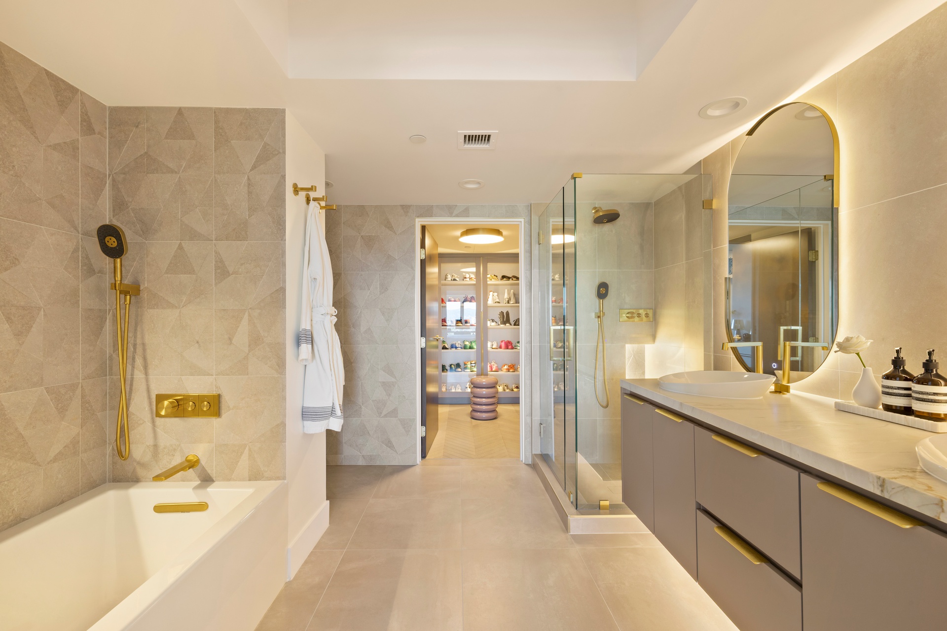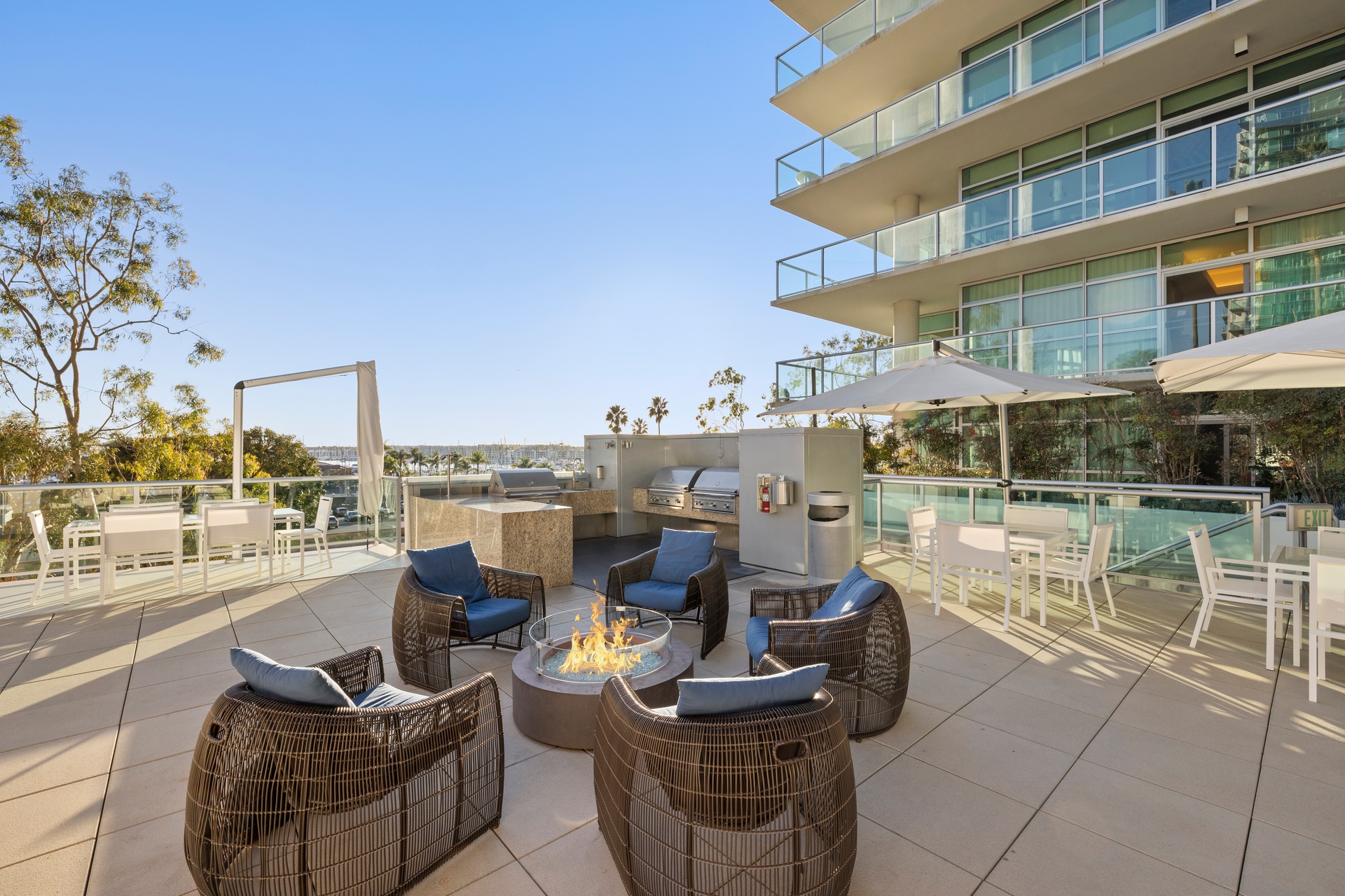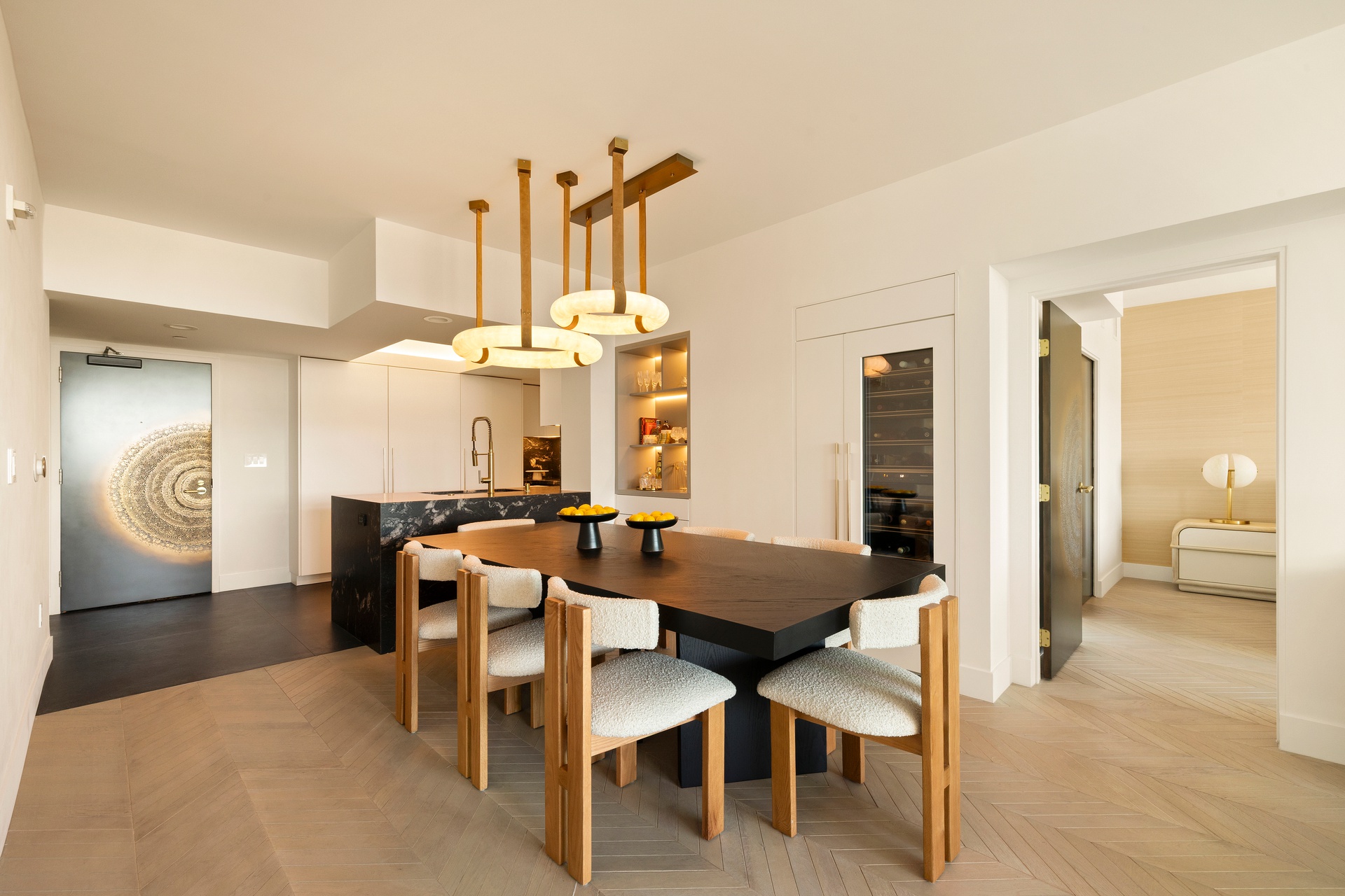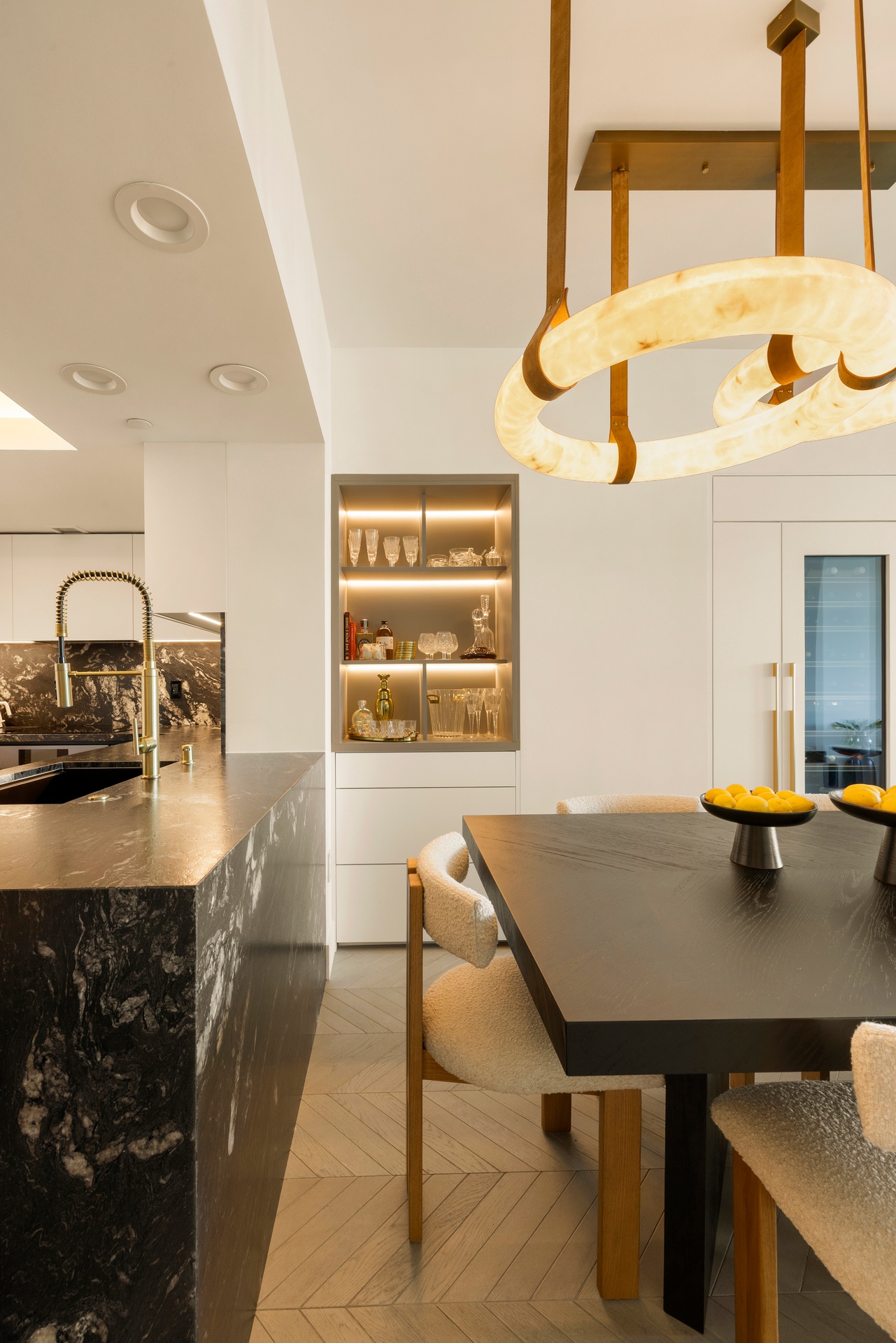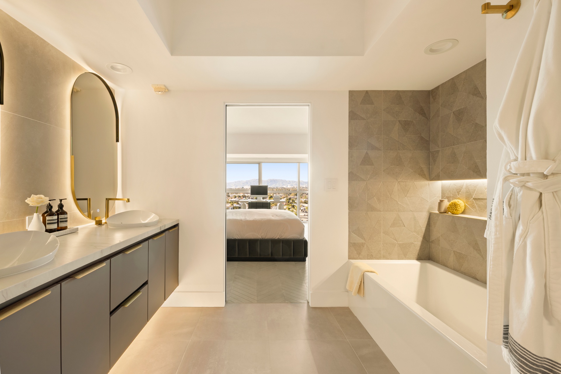 Impeccably designed and perched on the tenth floor of the exclusive Azzurra, this 2-bedroom, 2.5-bath residence showcases breathtaking views of the Marina and Santa Monica Mountains from every room. The interiors are defined by chevron Zanzibar European oak flooring, custom Liquid Metal doors with bespoke pulls, and curated finishes throughout. Luxe Phillip Jeffries wallcoverings in silk, linen, and vinyl snakeskin add depth and texture, while Lutron electronic shades and outlets provide effortless modern convenience. The sleek kitchen is outfitted with Dacor luxury appliances and a custom microwave drawer oven, flowing seamlessly into a spacious dining area highlighted by a custom alabaster and leather chandelier, a built-in bar, and an integrated Miele wine cooler - perfect for entertaining. The sun-filled living room features custom built-ins, an electric fireplace, and statement lighting, with glass doors opening to a private balcony for a seamless indoor-outdoor experience. A refined powder room completes the main living spaces. The serene primary suite offers space for a dedicated office nook overlooking the views and a hotel-style en-suite bath with a dual-sink vanity, glass-enclosed shower, soaking tub, and boutique-like closet. An equally sophisticated guest suite, in-unit laundry, and meticulous attention to detail throughout complete the home. Residents of Azzurra enjoy full-service, hotel-style living with 24/7 concierge, a resort-style pool and spa, a state-of-the-art indoor/outdoor fitness center, and an exceptional collection of amenities - all set in a premier Westside location.