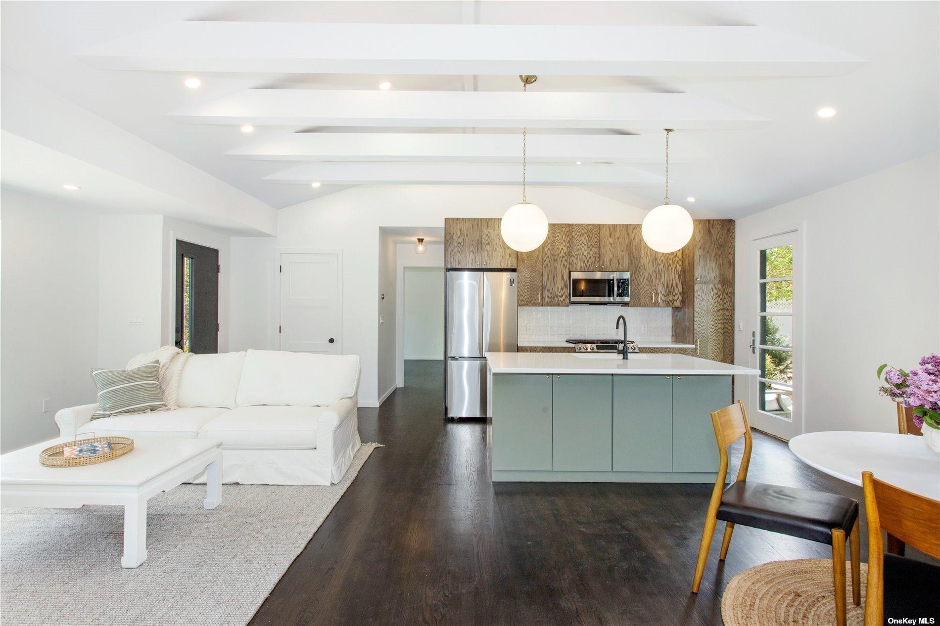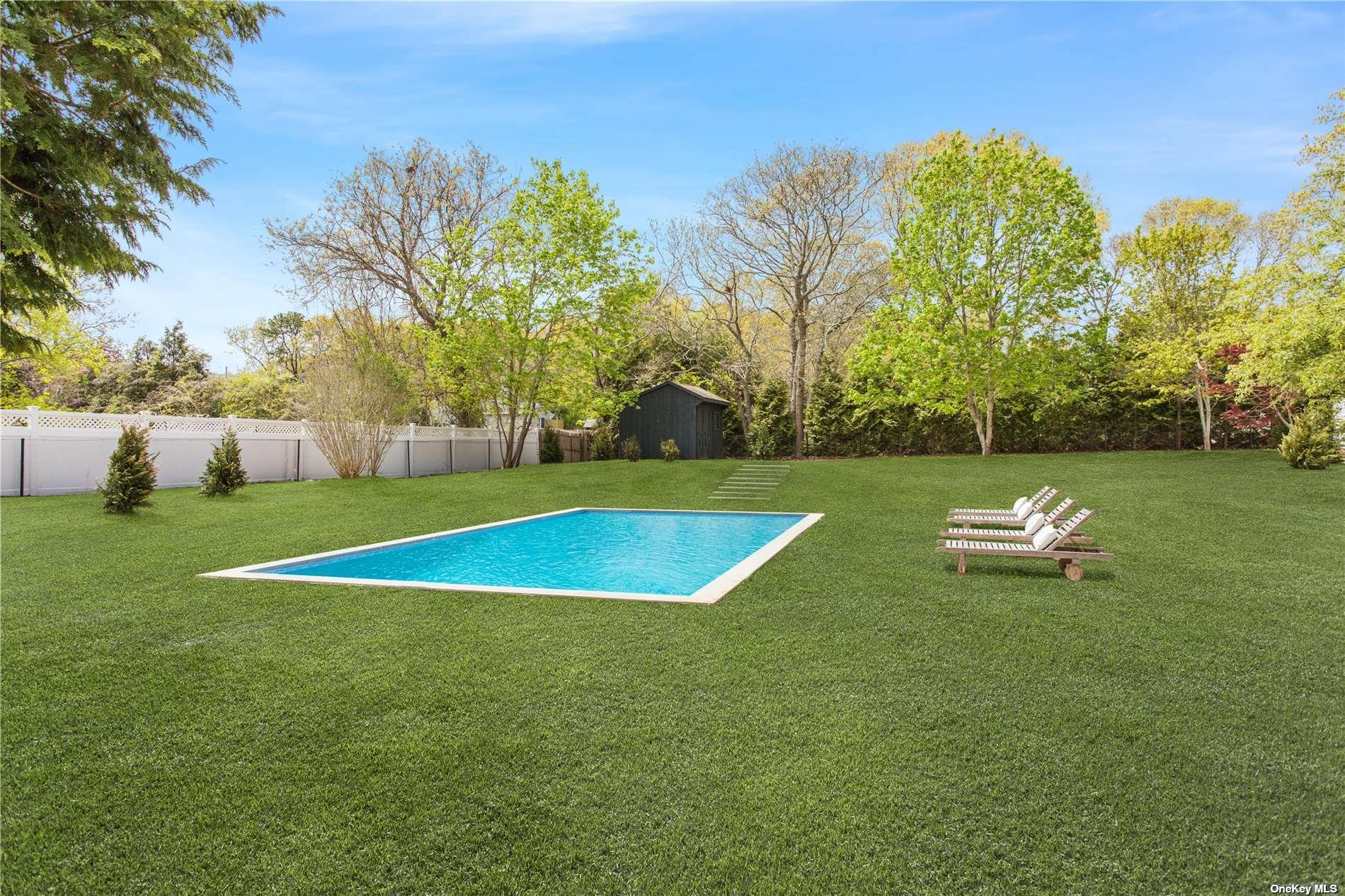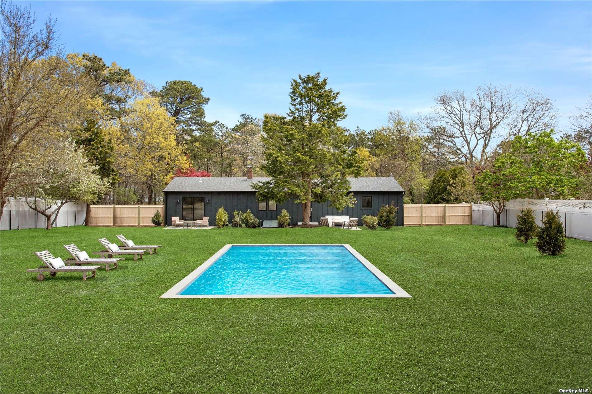 This design forward newly renovated ranch is ready for summer entertaining! New everything - electric, plumbing, roof, septic, HVAC and more. Huge backyard with a brand new in ground pool and irrigation system. Entertaining patio off the kitchen and bluestone patio off the master suite. The master suite features a fully built out walk-in closet and a luxurious bathroom complete with soaking tub. This thoughtful renovation included extensive insulation solutions for a quiet and energy efficient home. Custom kitchen cabinetry, quartz countertops, all new appliances, designer finishes, handmade tile, and fully outfitted closets throughout. A must see!
