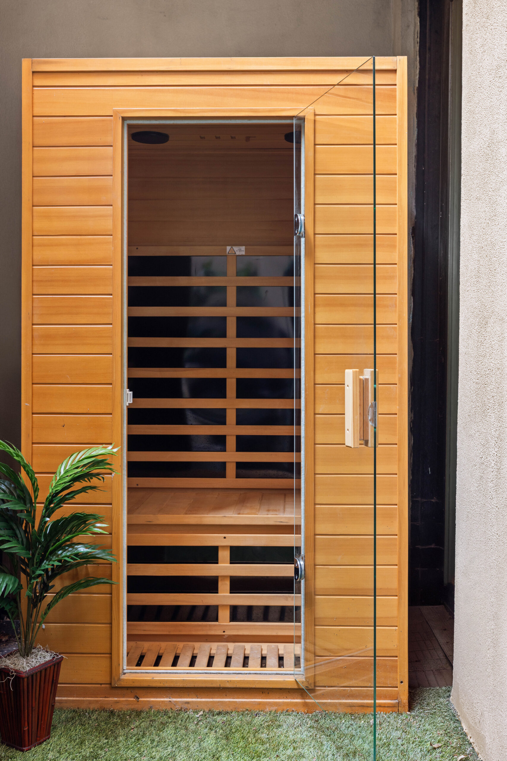 The open chef’s kitchen is equally refined, acting as a centerpiece of texture and design with misty gray granite countertops in a leather finish, custom soft-close white cabinetry with open shelving, and a suite of high-end stainless-steel appliances. White oak floors and floor-to-ceiling windows enhance the home’s airy, custom feel, while functional highlights include a laundry closet with a washer/dryer, bespoke custom shelving, and abundant storage throughout. The primary bedroom is conveniently located on the main level, while the lower level offers a versatile recreation room, currently used as a bedroom, complete with an ensuite half bathroom, a custom closet, and a private outdoor sanctuary featuring a sauna for a spa-like experience.