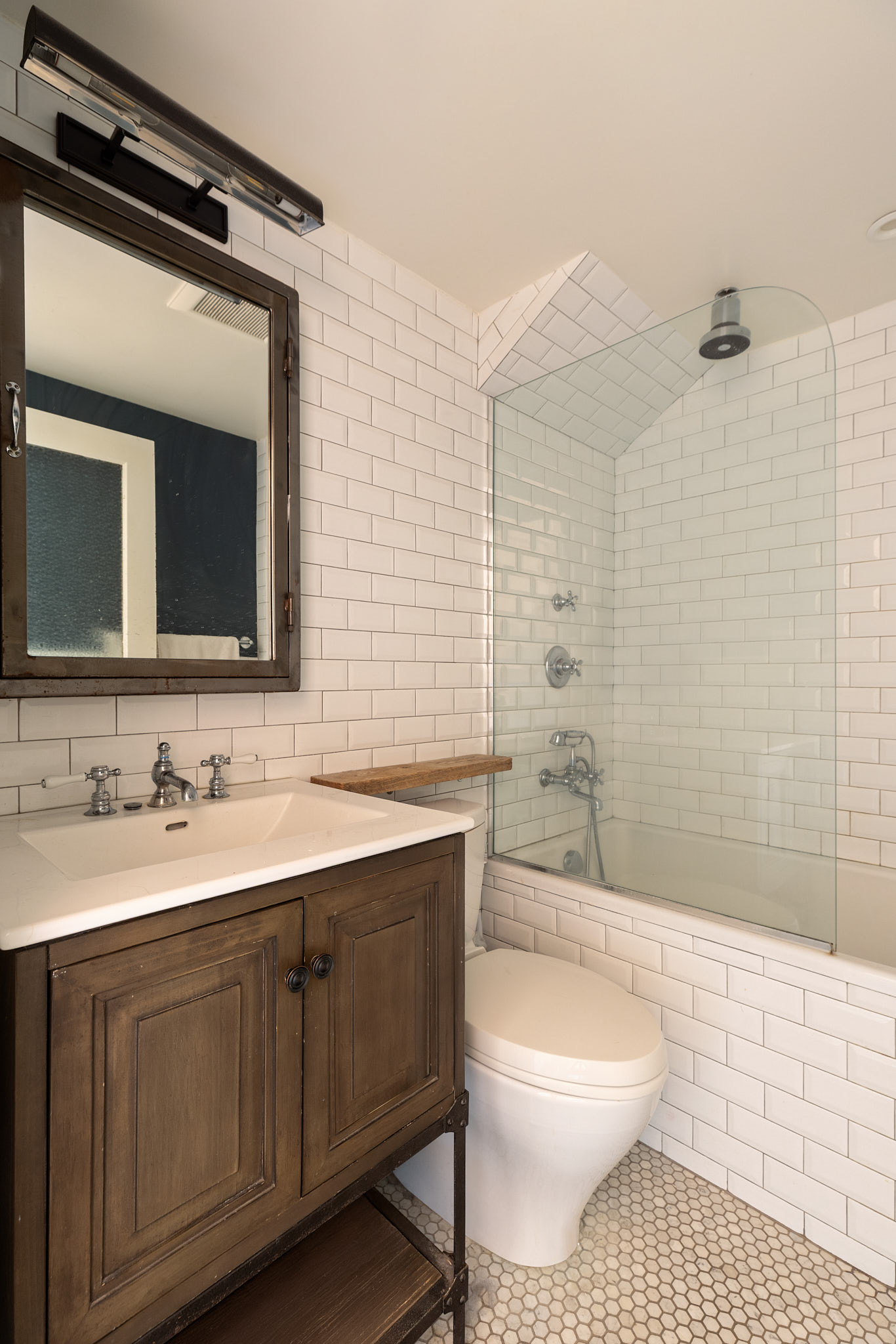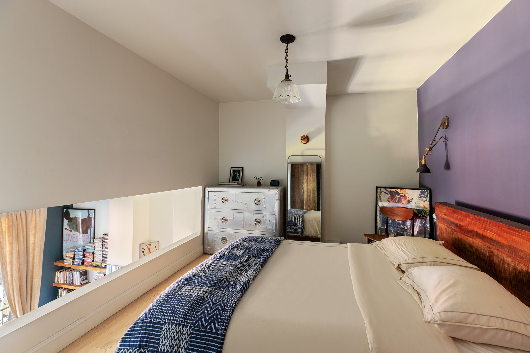 A striking industrial spiral staircase leads to the serene, lofted bedroom with over eight feet of full standing height. This private retreat includes a customized Elfa walk-in closet system and a salvaged wood sliding door that adds a touch of rustic charm. The spa-like bathroom is beautifully finished with Waterworks fixtures, a deep-soaking Toto tub, and Toto toilet, offering a luxurious escape.
