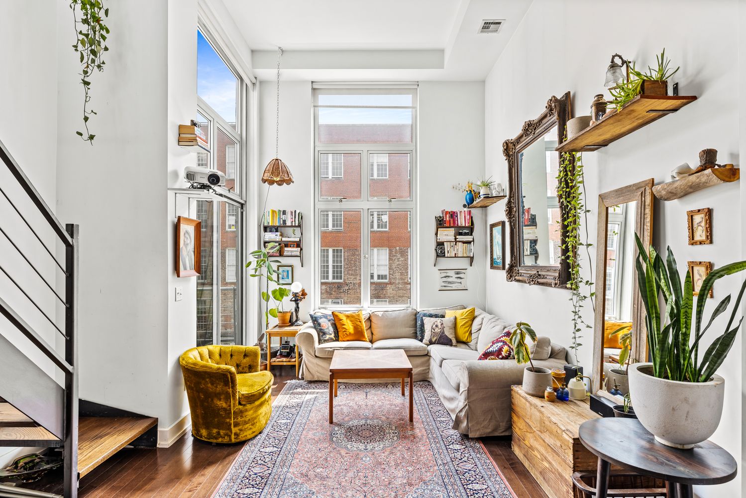 Unit 4B features soaring double-height ceilings, bright southern exposures, and over 500 square feet of private outdoor spaces including a large private roof terrace with ample seating and room for entertaining.
