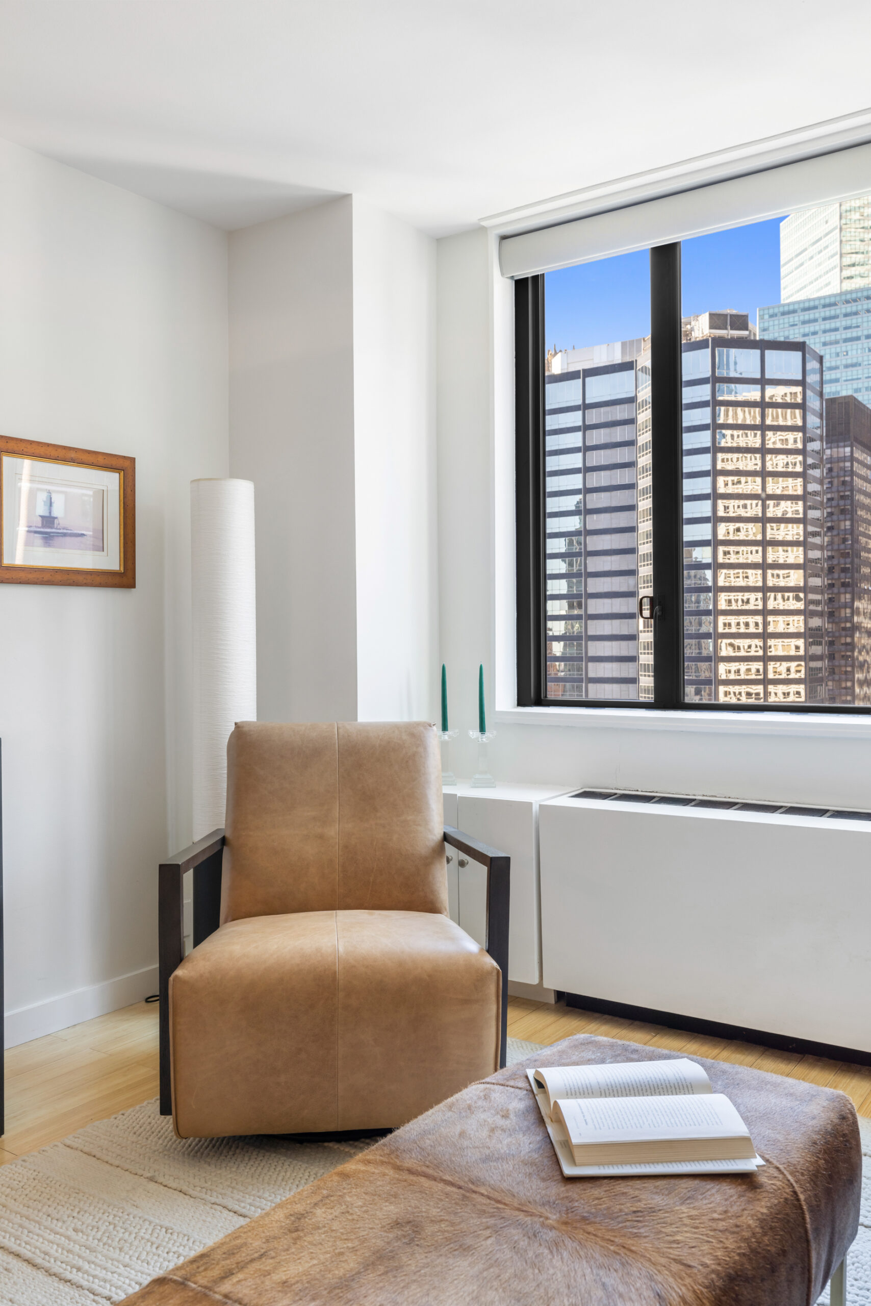 Located high above coveted Sutton Place, this meticulously updated one-bedroom residence captures sweeping south-facing city views, showcasing a dramatic New York skyline highlighted by the new JP Morgan tower and the iconic Chrysler Building. Oversized windows flood the home with natural light, complementing refined interiors that blend modern finishes with effortless functionality. The sleek kitchen is appointed with maple cabinetry, black granite countertops, a glass backsplash, and stainless steel appliances, while the contemporary bath features stone tile throughout, a Hansgrohe shower, and a streamlined vanity.