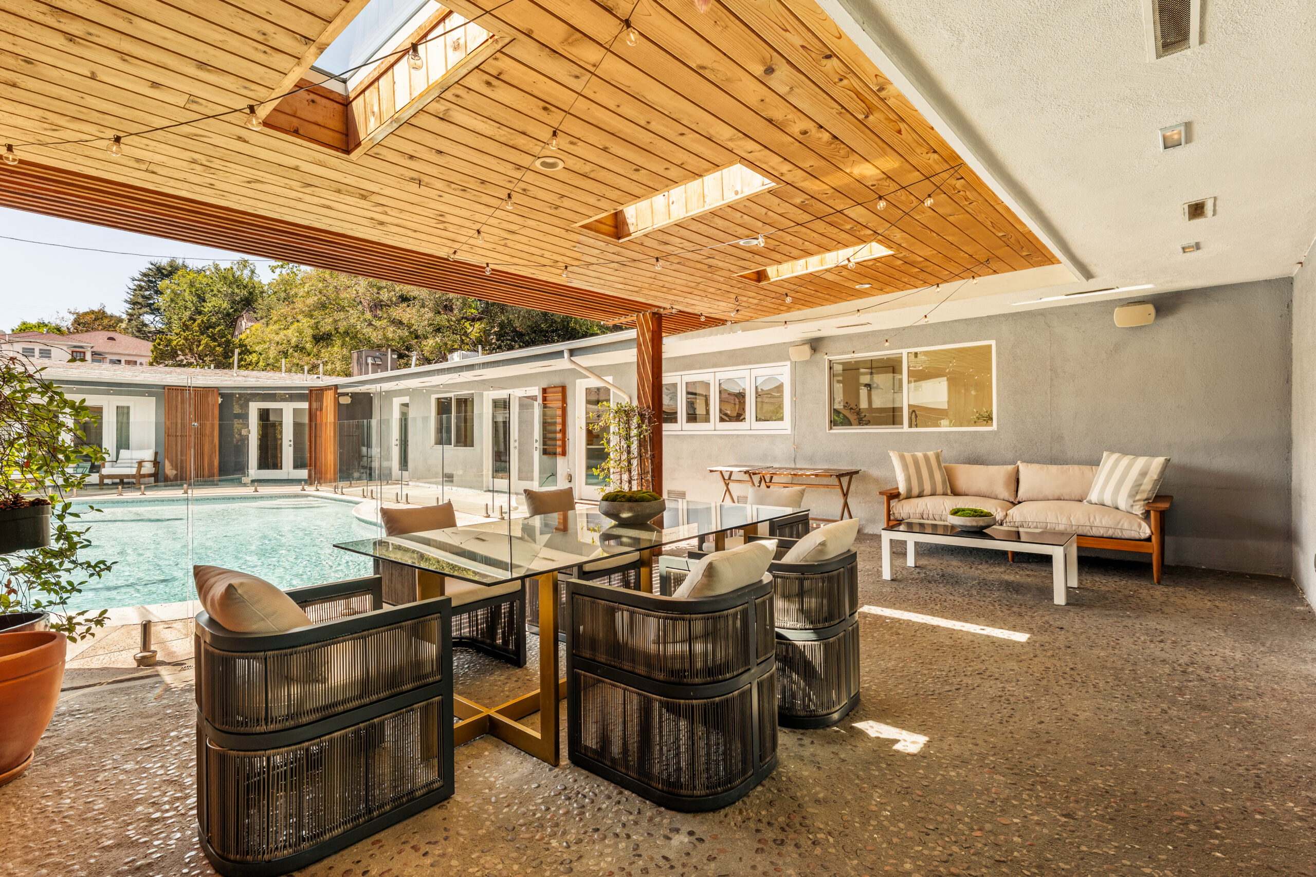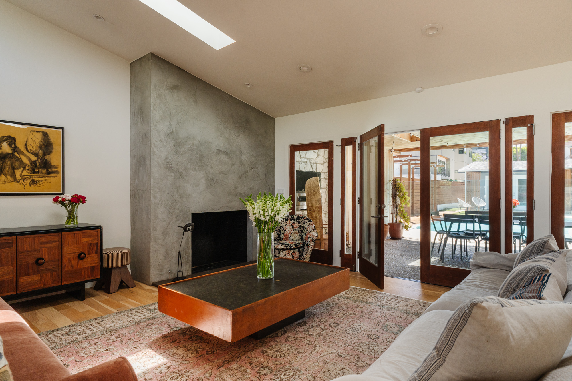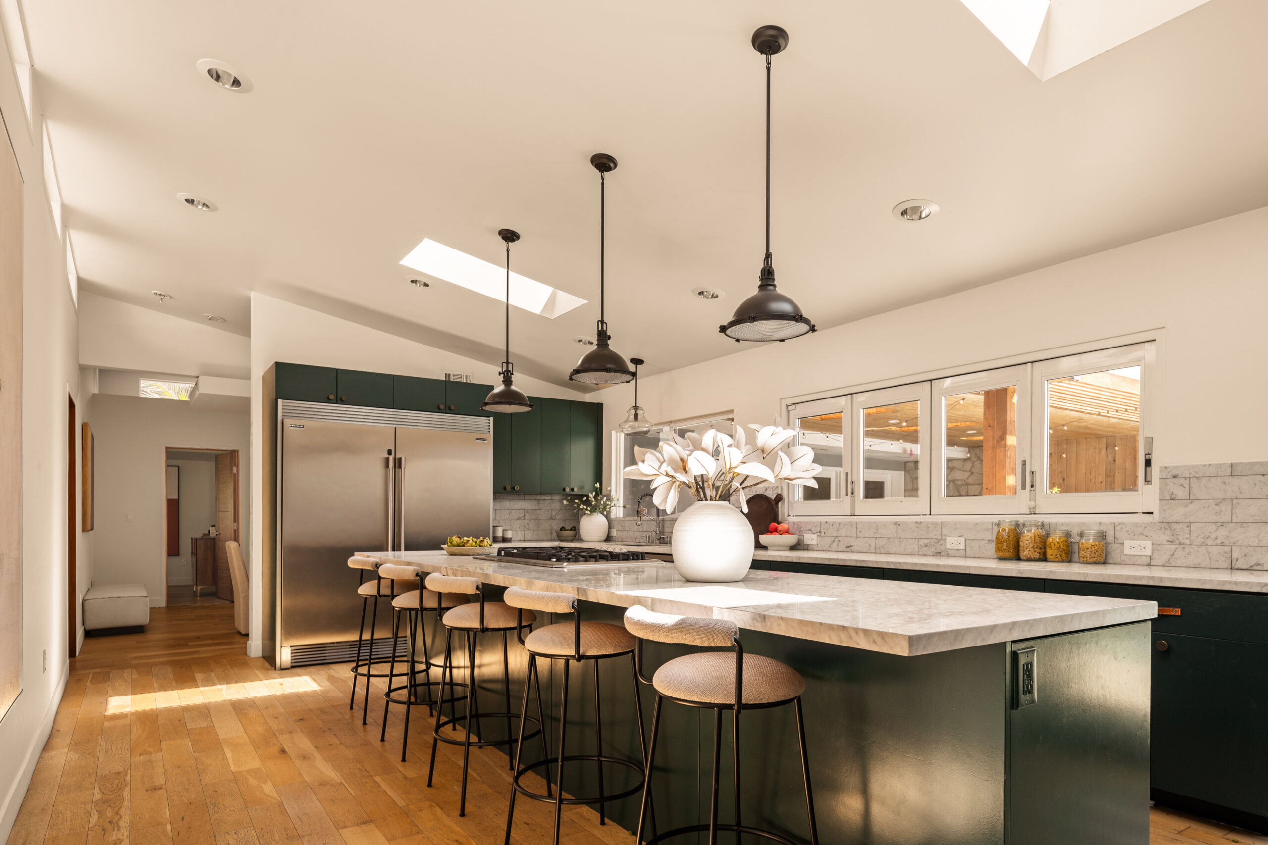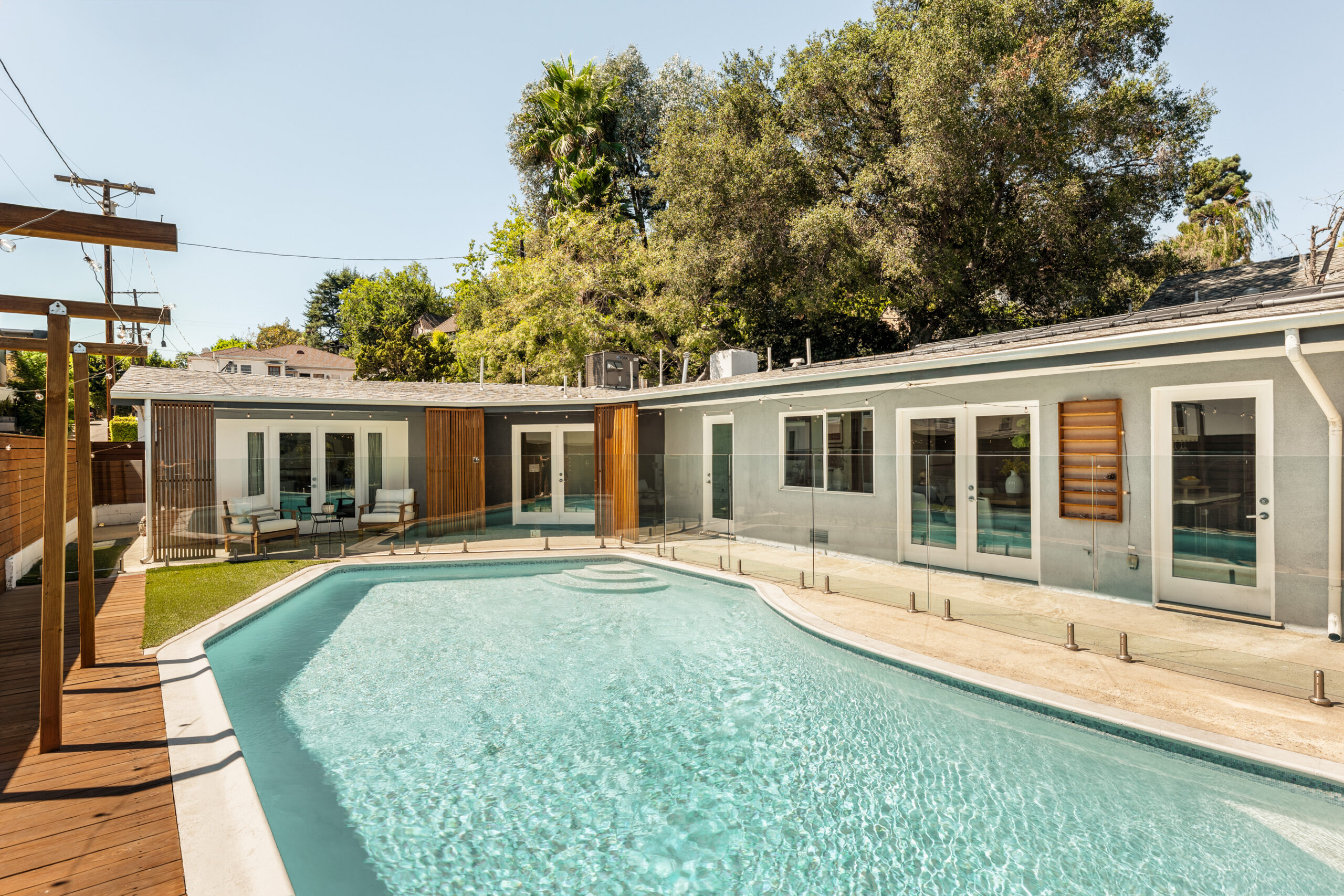 3019 Surry Street is a true contemporary charmer located in the coveted Ivanhoe School District. Set behind soaring trees that offer both beauty and privacy, this expansive 4-bedroom, 5.5-bath home boasts 3,457 square feet of thoughtfully designed living space. An inviting front porch leads into sunlit interiors, where dramatic skylights and warm wood floors define the open-concept layout. The spacious living room with a fireplace flows effortlessly into the formal dining area. At the heart of the home lies a chef's dream kitchen, featuring sleek modern cabinetry, high-end appliances, a wine cooler, a bread warmer, and an oversized eat-in island that comfortably seats five or more. A private, luxurious primary suite with direct access to the pool occupies one wing of the home and is situated near other well-appointed guest rooms, along with an additional primary suite option that also offers a spa-inspired designer bathroom. Additional highlights include a bonus den with casual dining space ideal for both entertaining and everyday living, a dedicated office, and a three-car garage. Indoor living transitions seamlessly to the outdoors through large glass doors, opening to a resort-like backyard with a covered patio, sparkling pool, open-air dining area, and lush lawn. Ideally located in the heart of Los Feliz - close to top restaurants, entertainment, and parks - 3019 Surry Street embodies the best of California living.