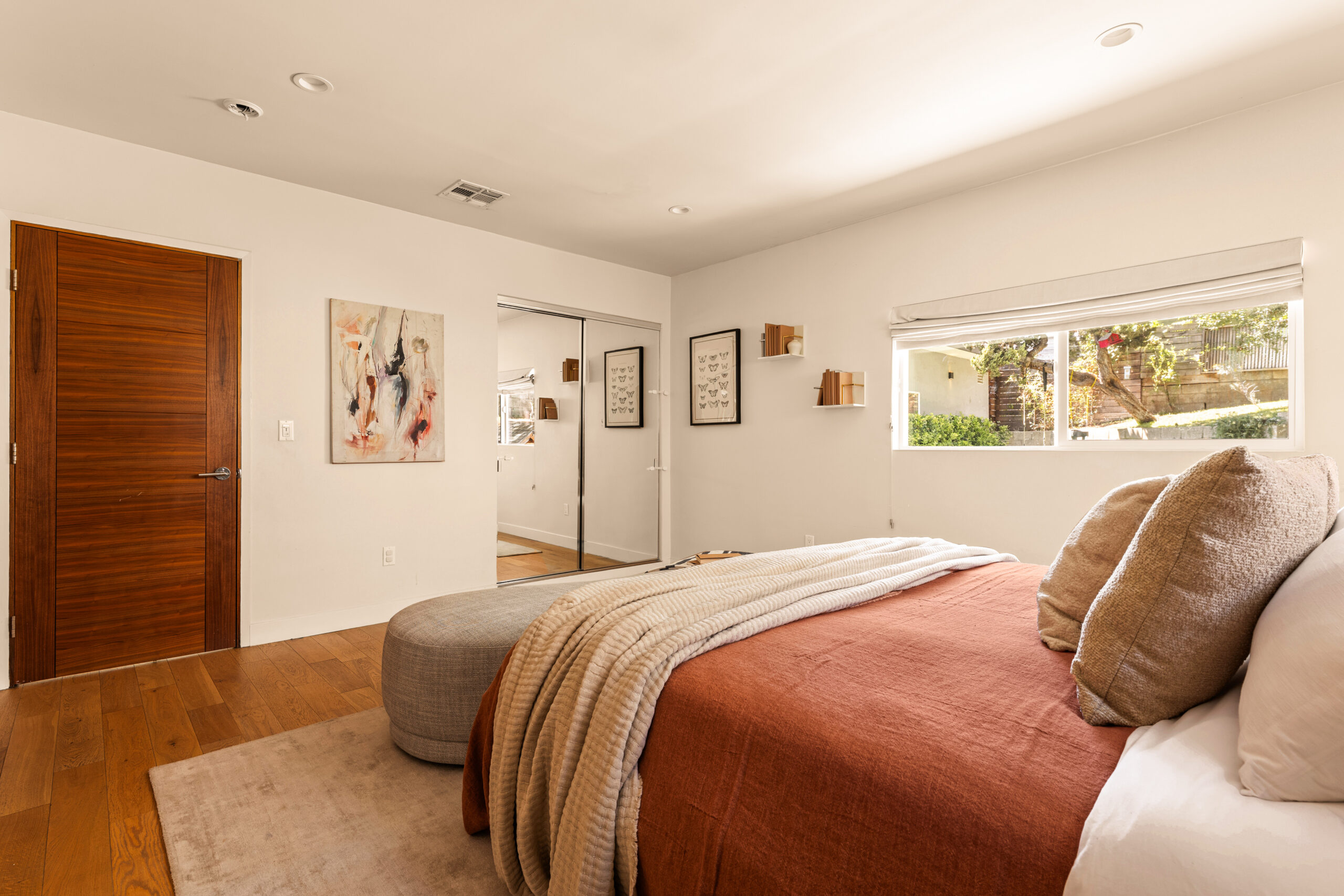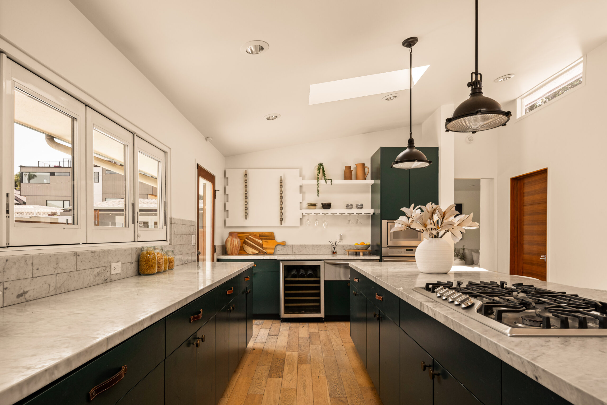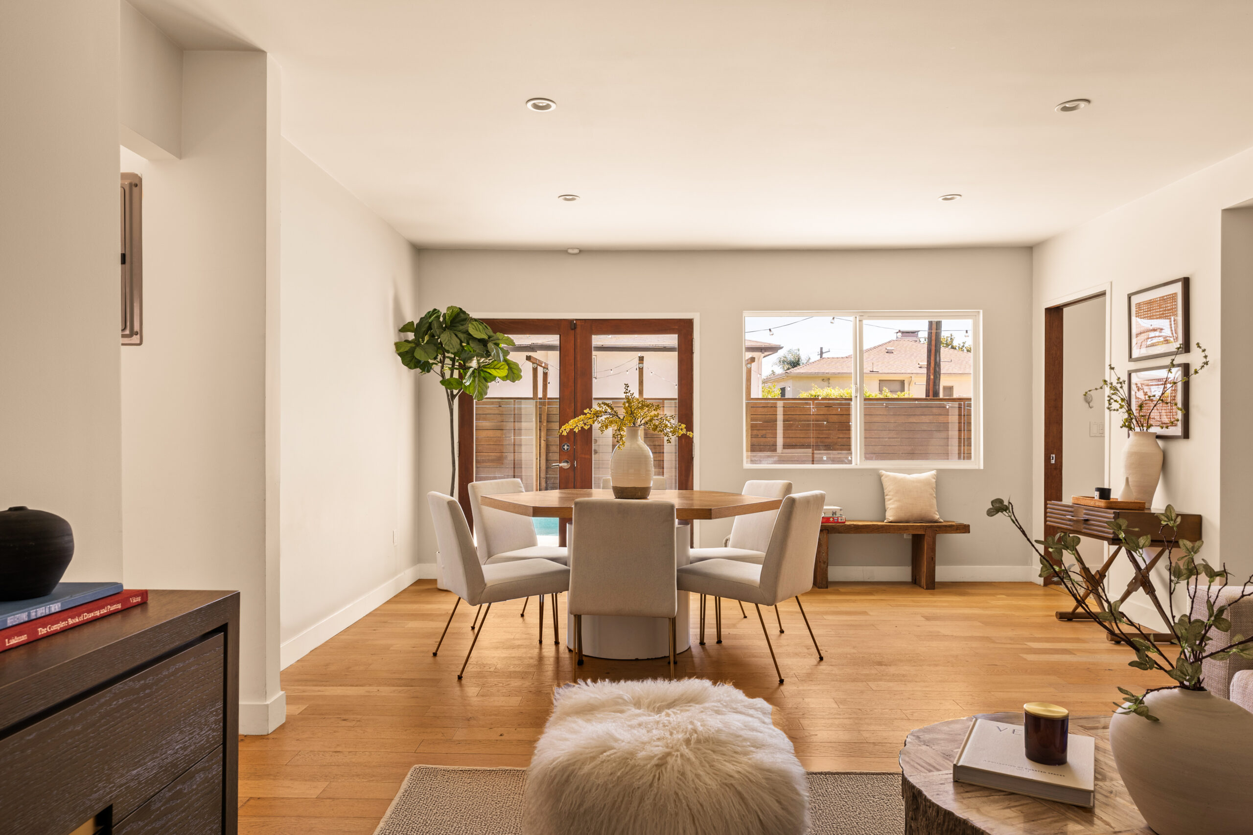 3019 Surry Street is a true contemporary charmer located in the coveted Ivanhoe School District. Set behind soaring trees that offer both beauty and privacy, this expansive 4-bedroom, 5.5-bath home boasts 3,457 square feet of thoughtfully designed living space. An inviting front porch leads into sunlit interiors, where dramatic skylights and warm wood floors define the open-concept layout. The spacious living room with a fireplace flows effortlessly into the formal dining area. At the heart of the home lies a chef's dream kitchen, featuring sleek modern cabinetry, high-end appliances, a wine cooler, a bread warmer, and an oversized eat-in island that comfortably seats five or more. A private, luxurious primary suite with direct access to the pool occupies one wing of the home and is situated near other well-appointed guest rooms, along with an additional primary suite option that also offers a spa-inspired designer bathroom. Additional highlights include a bonus den with casual dining space ideal for both entertaining and everyday living, a dedicated office, and a three-car garage. Indoor living transitions seamlessly to the outdoors through large glass doors, opening to a resort-like backyard with a covered patio, sparkling pool, open-air dining area, and lush lawn. Ideally located in the heart of Los Feliz - close to top restaurants, entertainment, and parks - 3019 Surry Street embodies the best of California living.