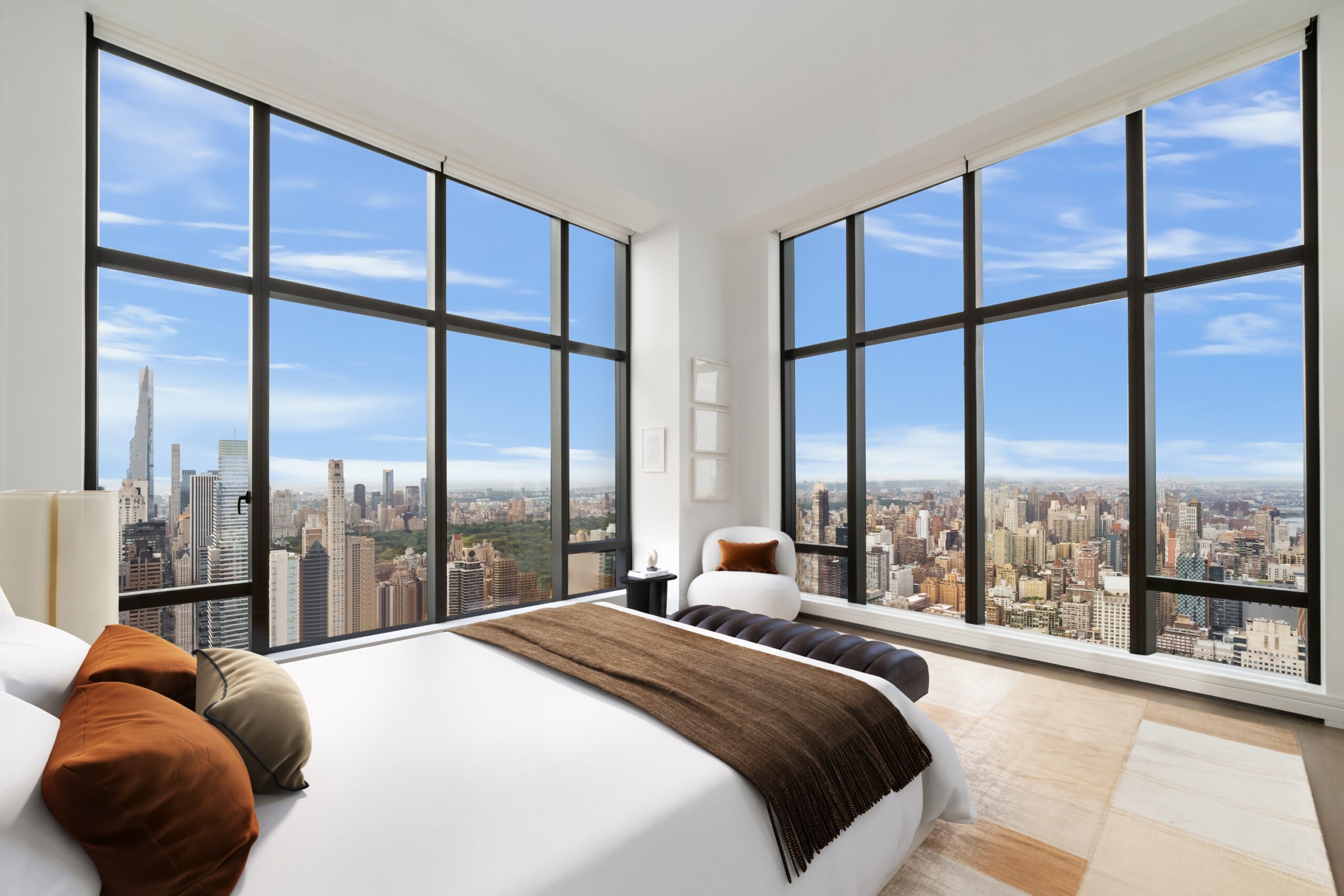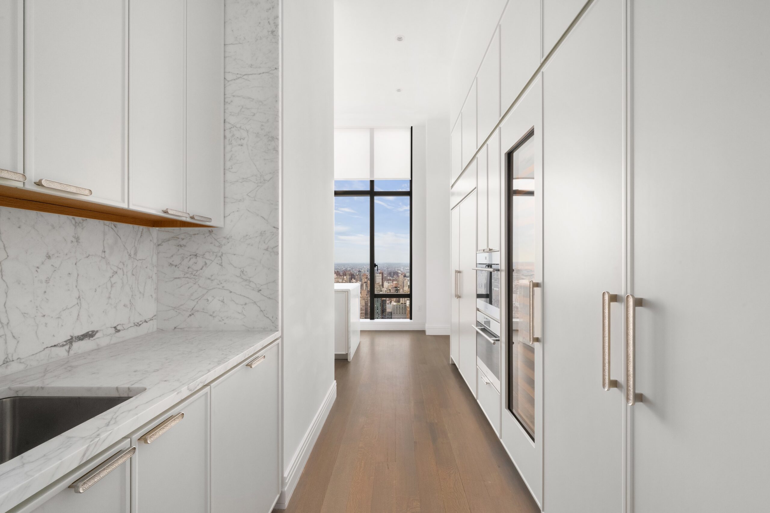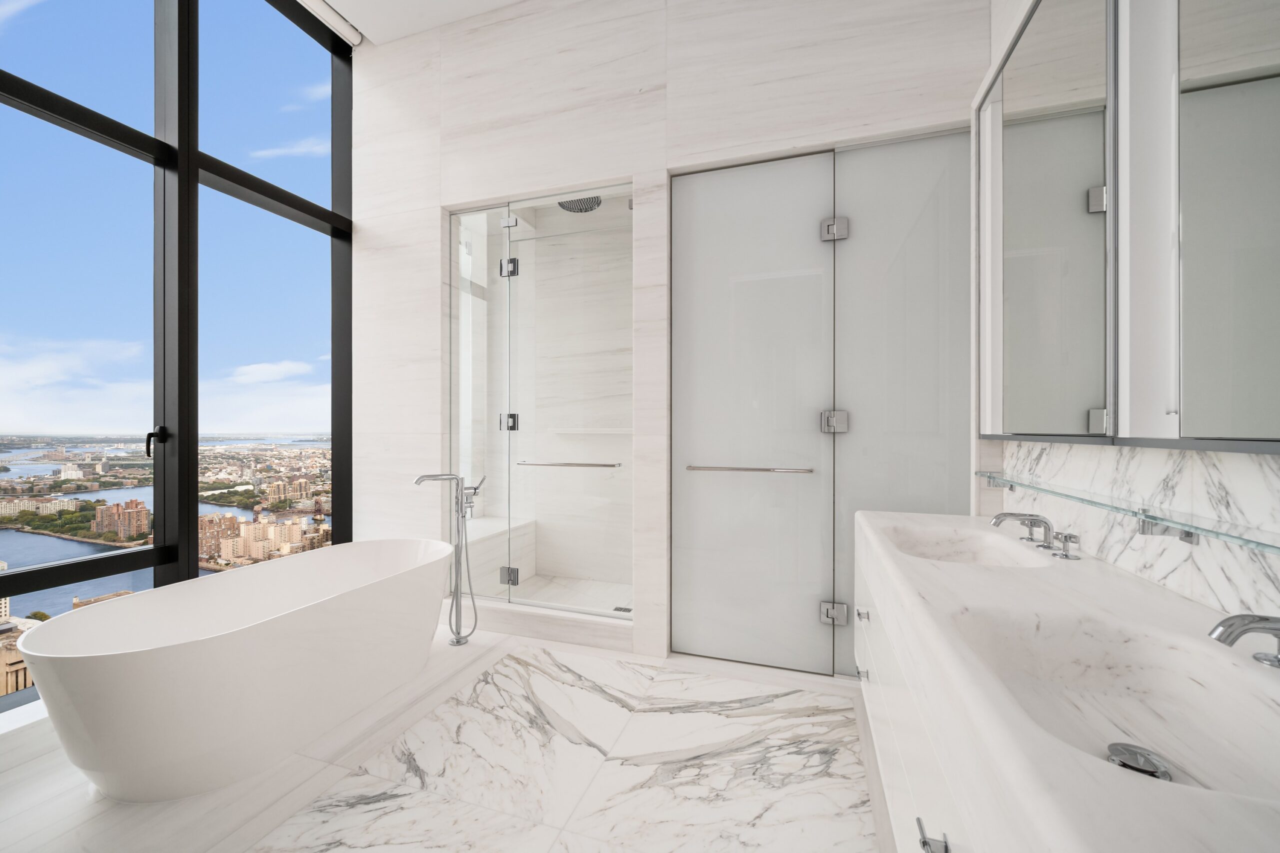 Commanding an entire floor, Penthouse 72 at Sutton Tower offers a truly breathtaking vantage point with uninterrupted 360-degree views of New York City’s skyline, rivers, and iconic landmarks. Designed by renowned architect Thomas Juul-Hansen, this sprawling 4,765-square-foot residence features 4 bedrooms and 4.5 baths, with every room oriented to maximize light, space, and the city’s ever-changing vistas. Direct elevator access opens into a dramatic great room with soaring 15-foot ceilings and southeastern exposure, framed by floor-to-ceiling windows that flood the space with natural light. The north-facing kitchen is a showpiece, featuring a Statuarietto marble island, Italian matte lacquer cabinetry, and a full suite of Sub-Zero and Wolf appliances, seamlessly connected to a formal dining room with sweeping northeastern views.