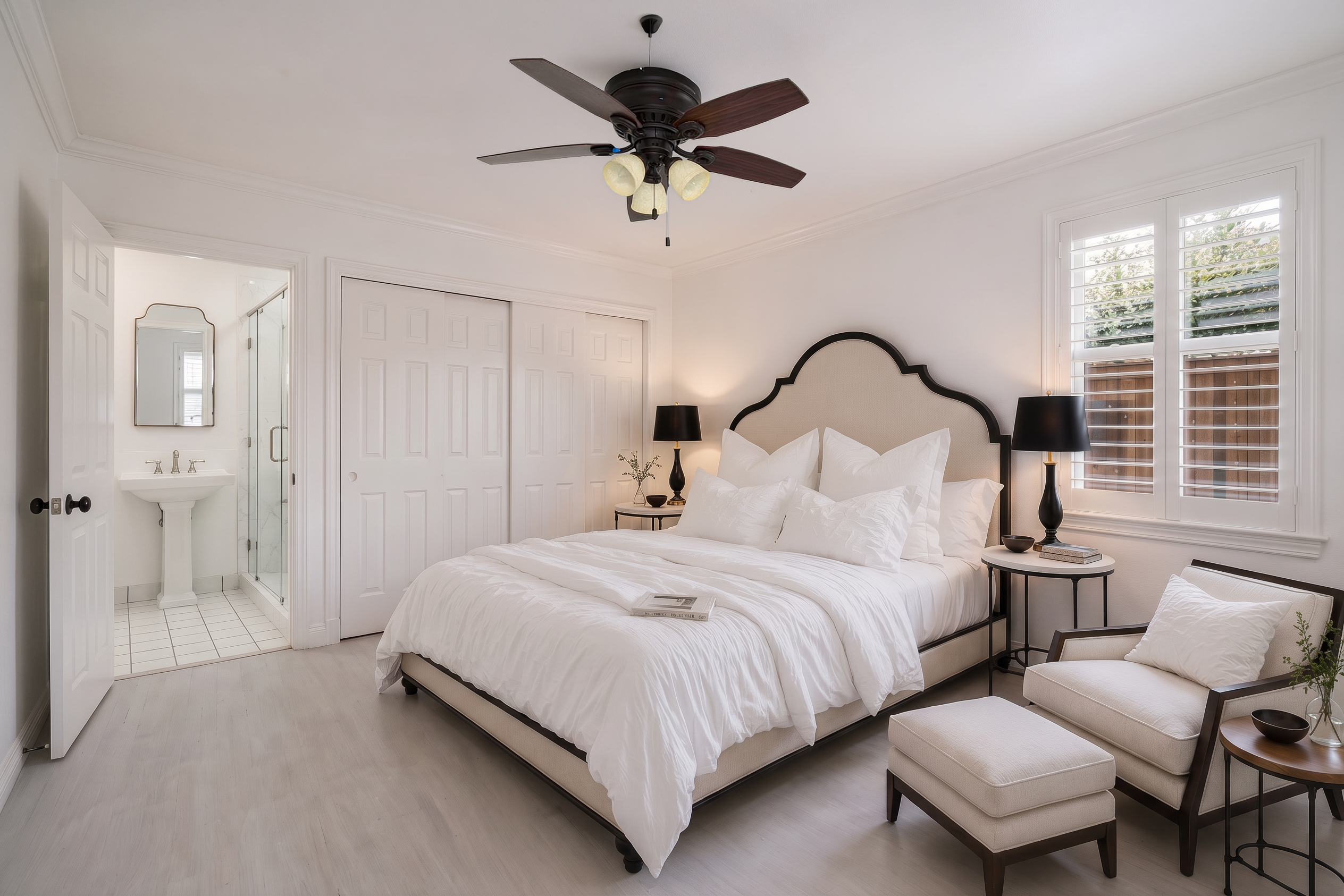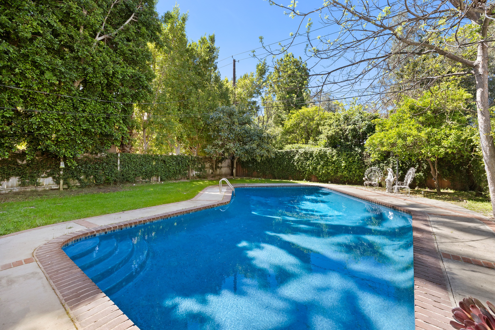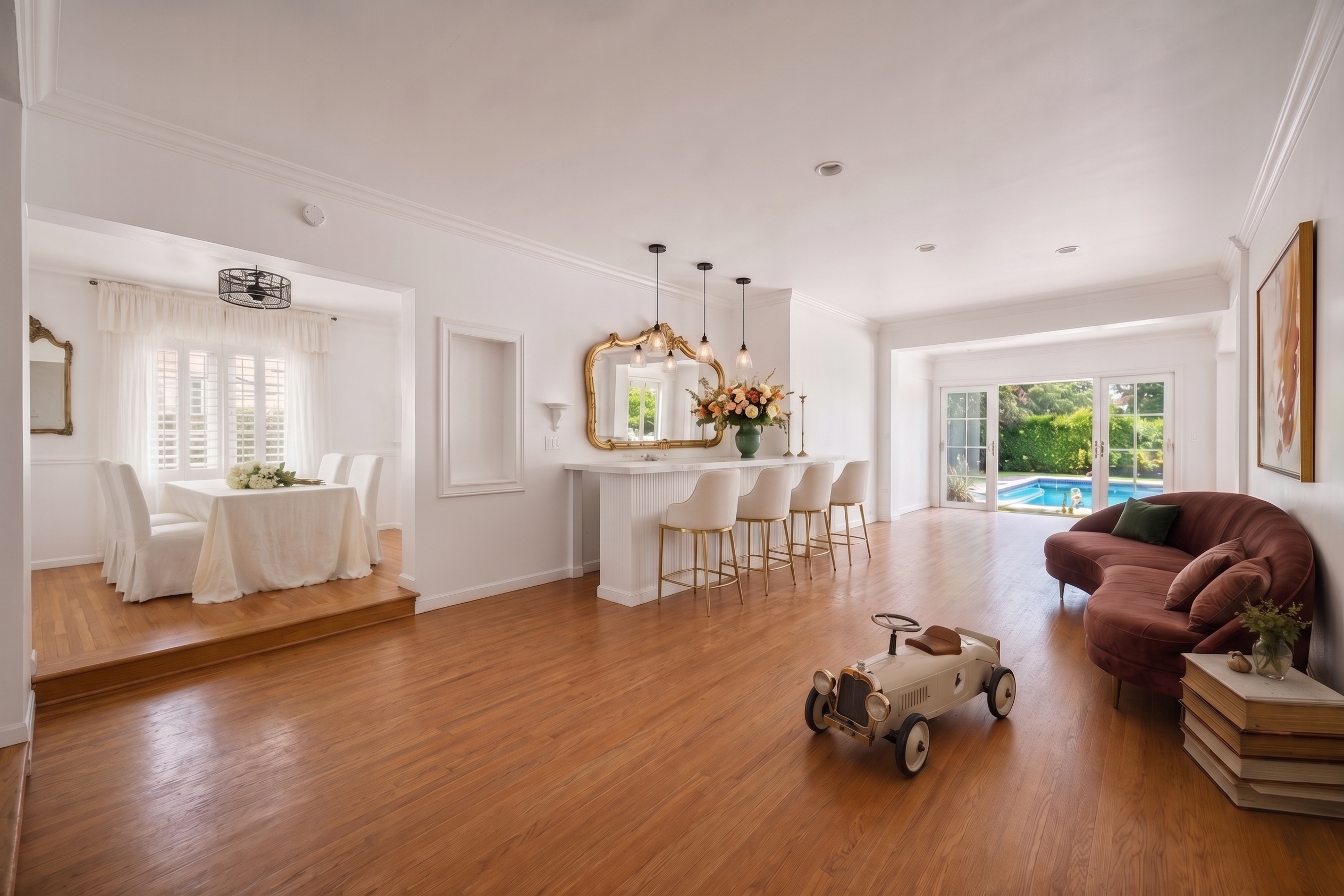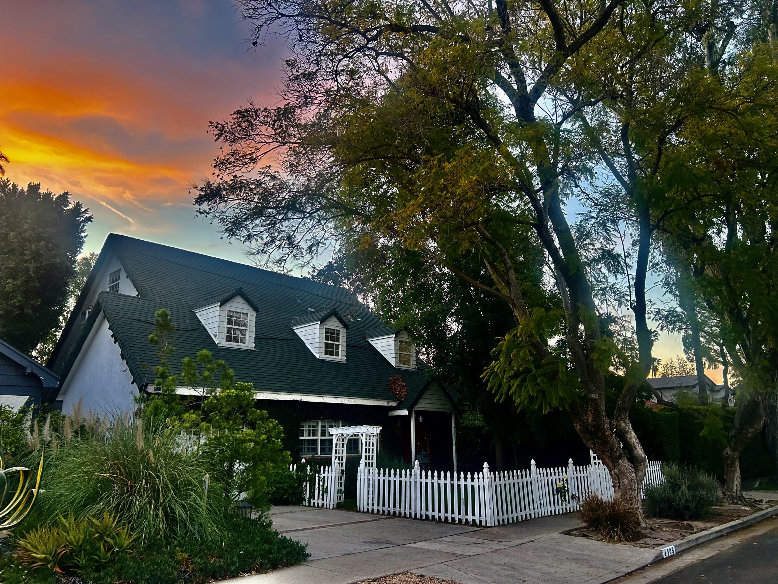 Gentry Rose Manor evokes the romance and charm of a storybook English cottage, reimagined at an impressive approximately 3,800-square-foot scale within Studio City's historic and coveted "The Grove" enclave. Tucked along a quiet residential pocket, the residence unfolds through expansive living spaces. A built-in bar anchors multiple gathering areas, while walls of windows and oversized sliding glass doors blur the line between indoors and out, inviting natural light and garden views throughout. The vintage-inspired kitchen with breakfast nook pairs beautifully with a formal dining room, and a first-floor ensuite bedroom offers ideal flexibility for guests, a home office, or multigenerational living. Upstairs, the spacious primary suite serves as a serene retreat, featuring a custom walk-in closet, an elegant ensuite bath, and a private terrace with treetop vistas overlooking the secluded backyard and pool. Two additional generously sized guest bedrooms on the second floor each feature walk-in closets and share a well-appointed bathroom with classic finishes. An additional upper-level suite provides versatile space for guest quarters, a creative studio, gym, or optional fifth bedroom. Outside, enchanting lush grounds surround a large pool designed for relaxation and entertaining, while a direct-access garage adds everyday convenience. The upper level also offers extensive hidden storage, thoughtfully finished with hardwood flooring and sheetrock along both sides, including a window-lined nook providing an abundance of functional and easily accessible space. Ideally positioned near Ventura Boulevard's celebrated dining, shopping, and cafes, the Studio City Farmers Market, and Radford (CBS) Studio Center, where legendary early television and film history originated, and just minutes from Universal Studios and the Metro Line, the home is also located within the Carpenter Community Charter and Walter Reed Middle School districts.