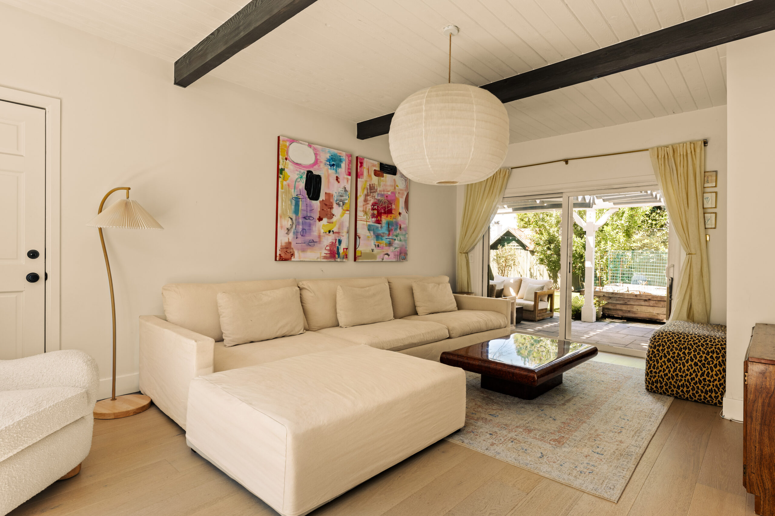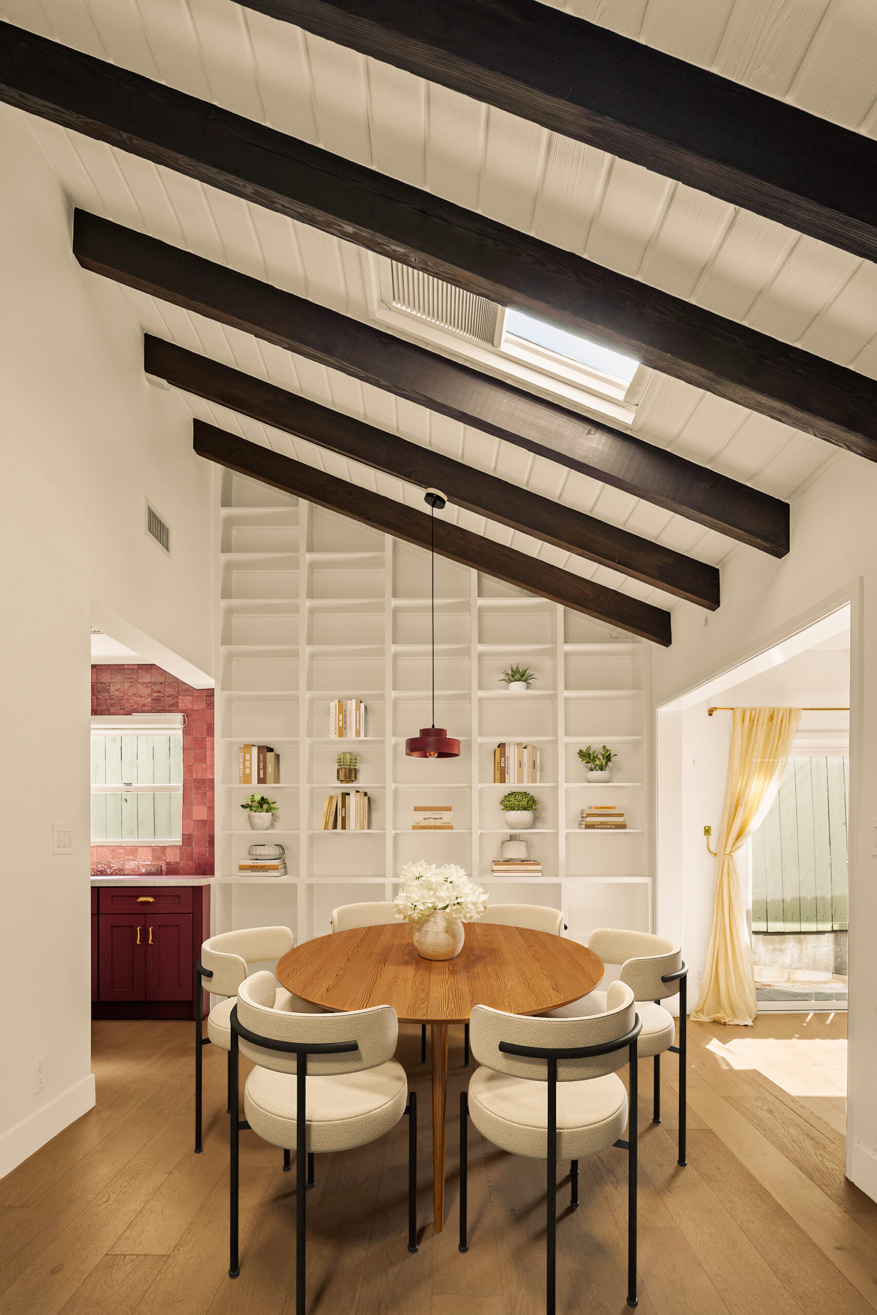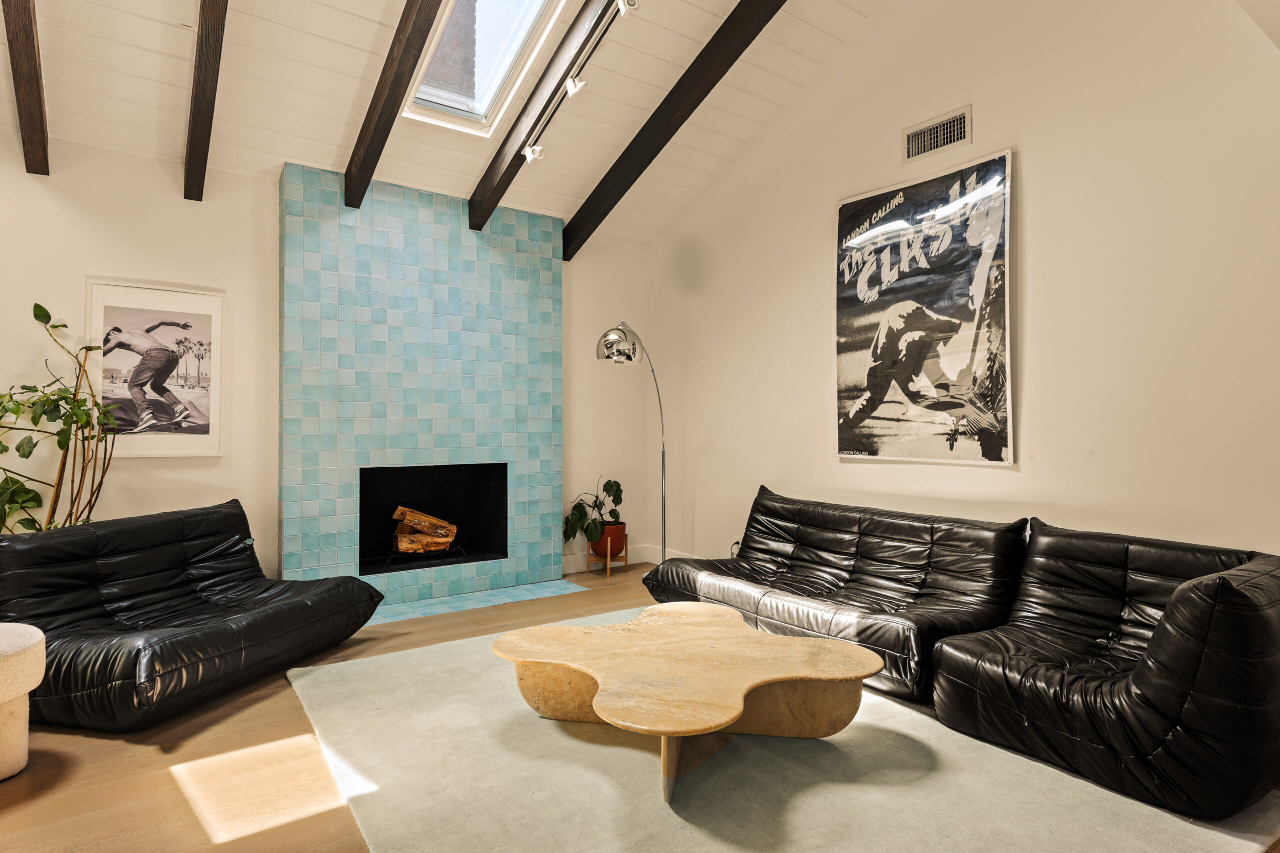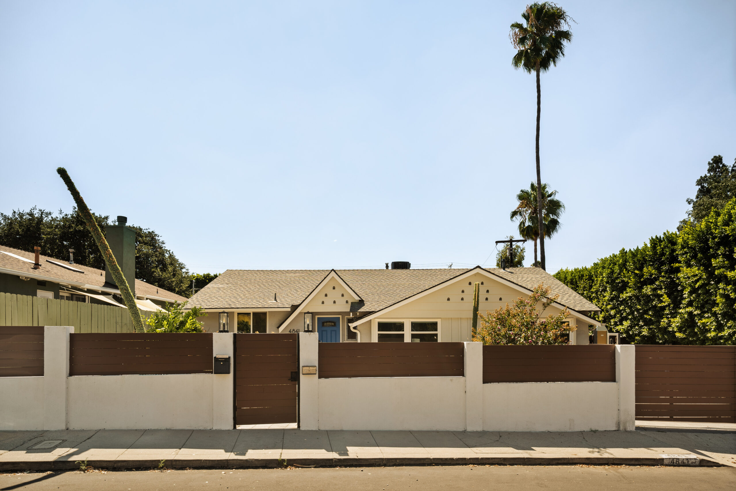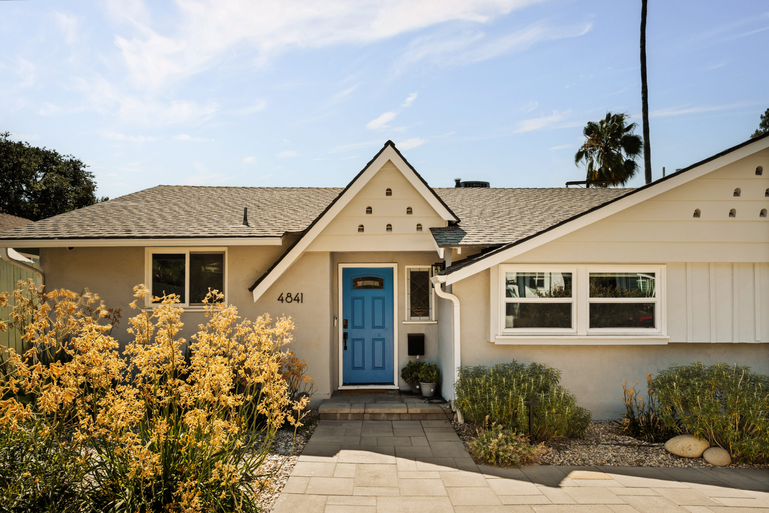 Set behind a gated entry, 4841 Don Pio Dr is a curated Woodland Hills residence that blends privacy, natural light, and refined design. This three-bedroom, two-bath home, plus a converted garage ideal for a studio, gym, or office, offers open-concept living enhanced by exposed beams, skylights, and thoughtful details throughout. A striking teal-tiled fireplace anchors the main living area, while the newly renovated kitchen features custom cabinetry, designer tile work, and stainless steel appliances. The spacious primary suite includes an en-suite bathroom, while two additional bedrooms offer flexibility. A secondary living room with double exposure open to a serene outdoor setting with a covered patio, turfed lawn, sauna, citrus trees, and lush garden beds. The property is equipped with solar panels, offering both sustainability and efficiency, and is securely gated with EV charging station. Ideally located near Ventura Blvd and The Commons at Calabasas, this gated home captures the essence of elevated California living with timeless style and comfort.