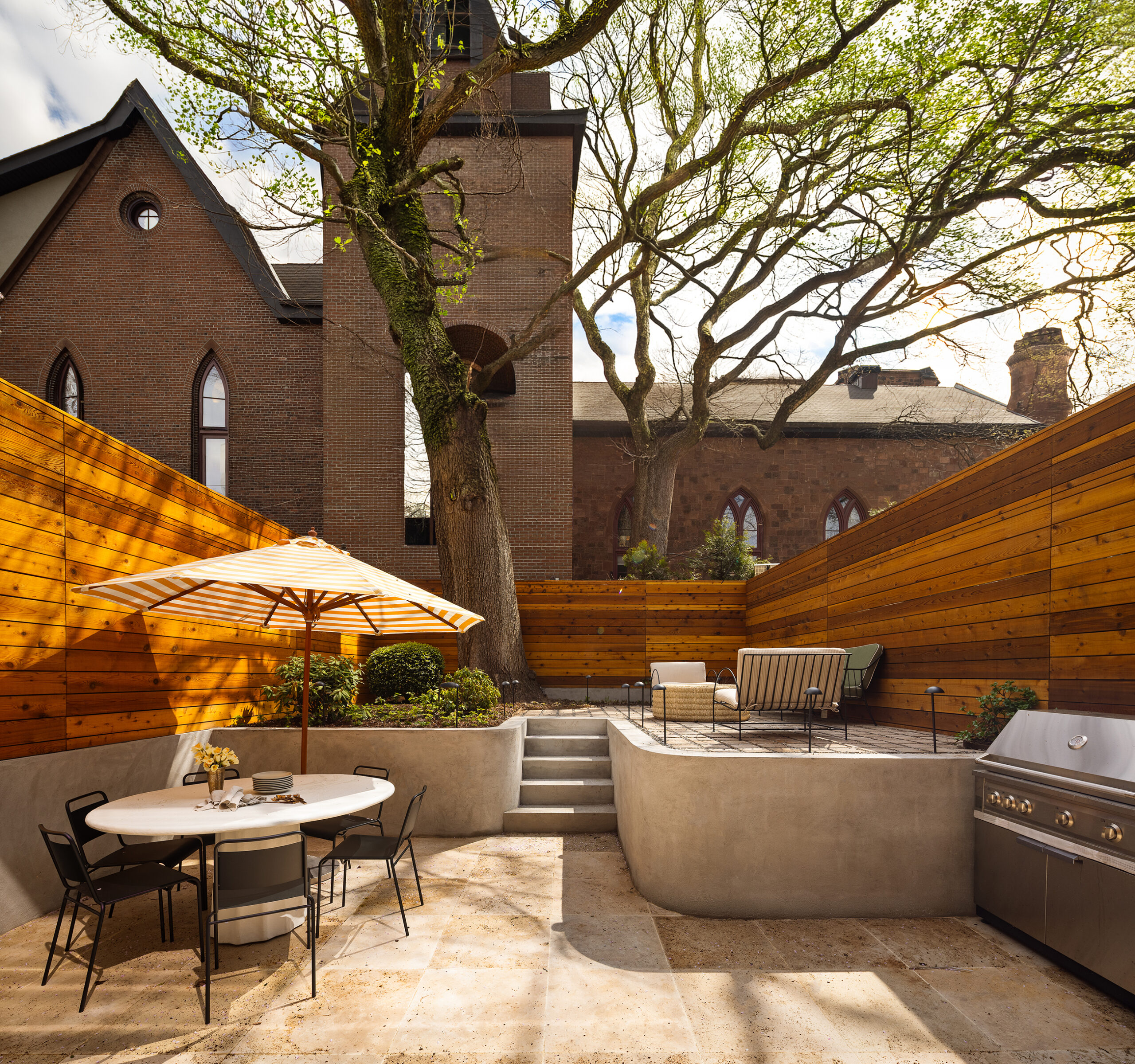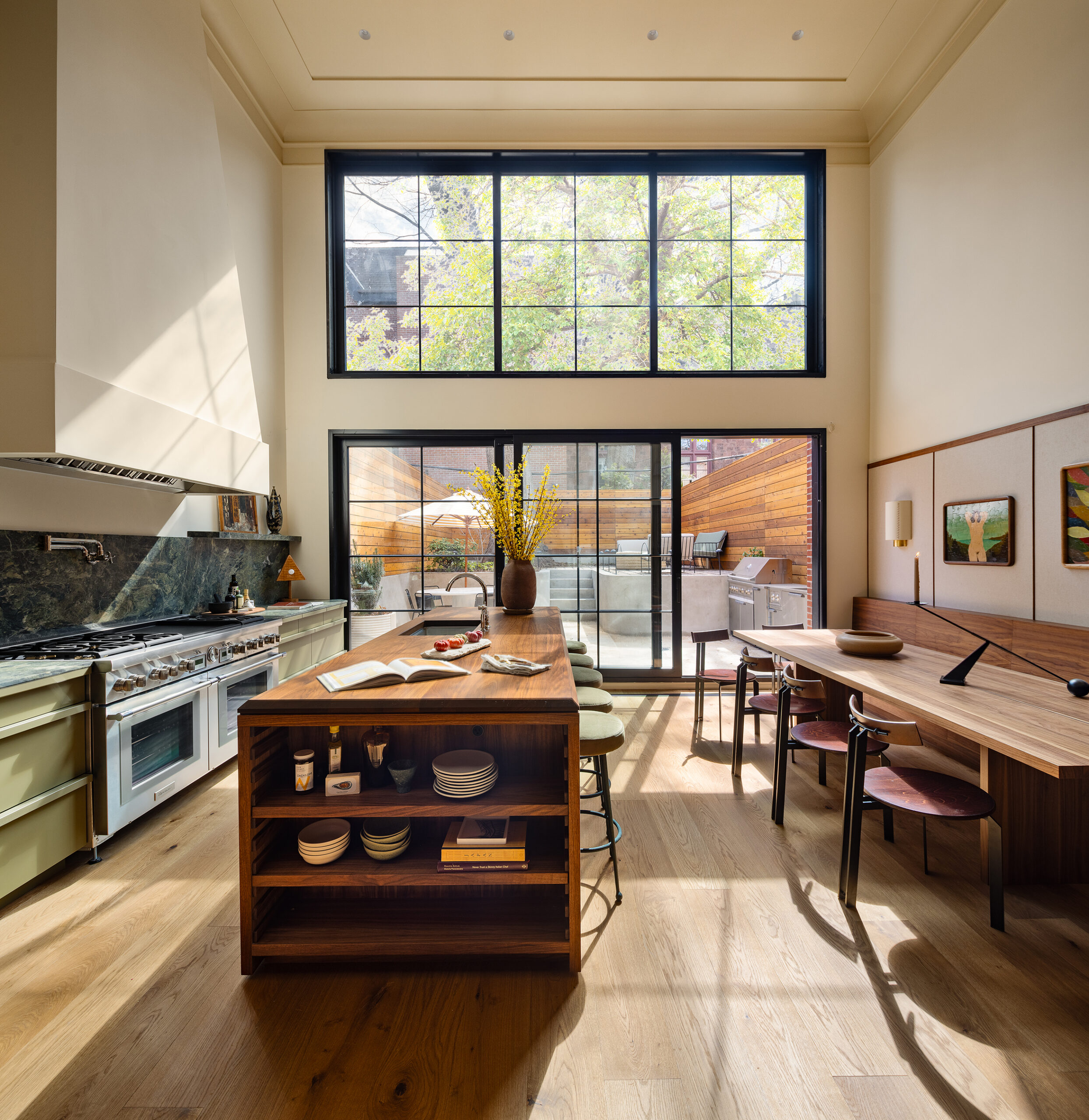The parlor level is centered around entertaining, with generous ceiling heights and a natural flow between living and dining. Below, the kitchen opens directly to the private garden, creating a more informal setting for the quiet rituals of daily life.