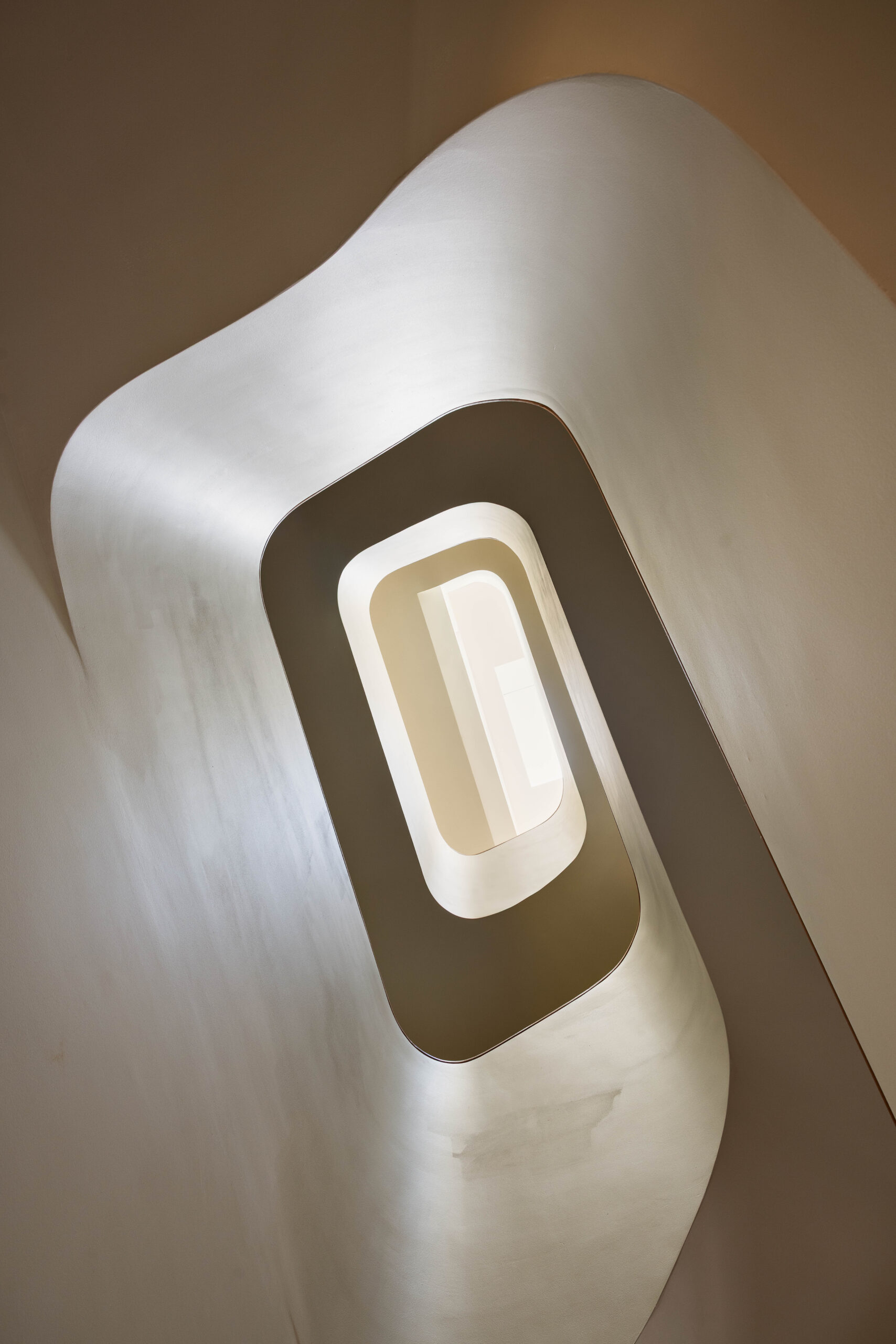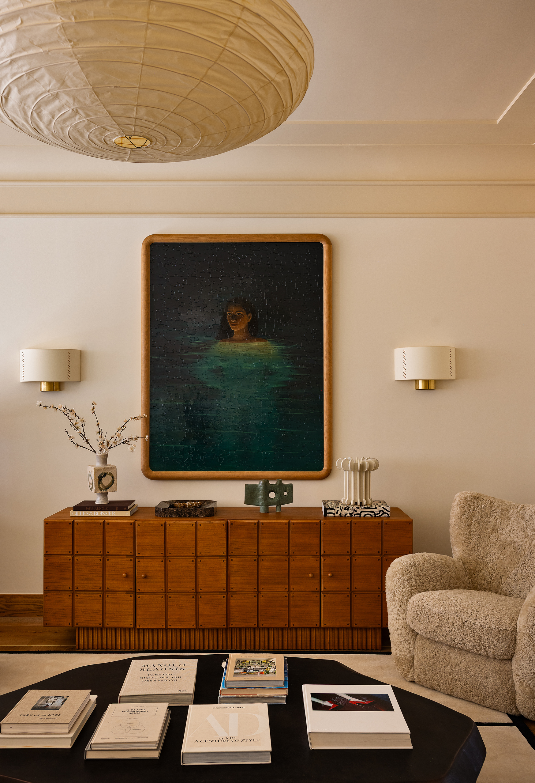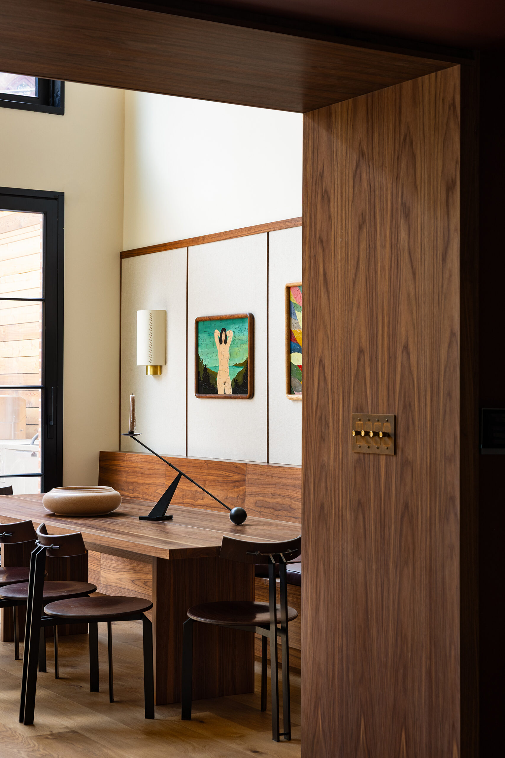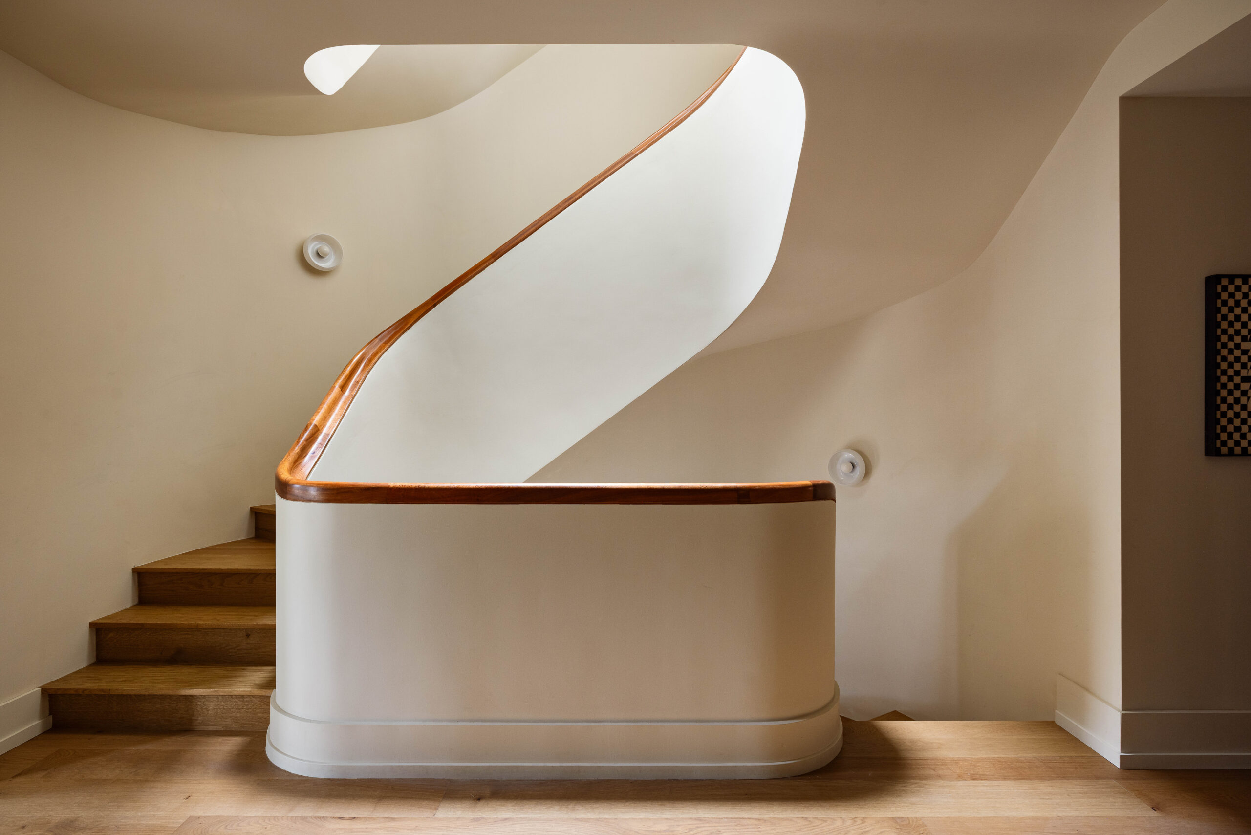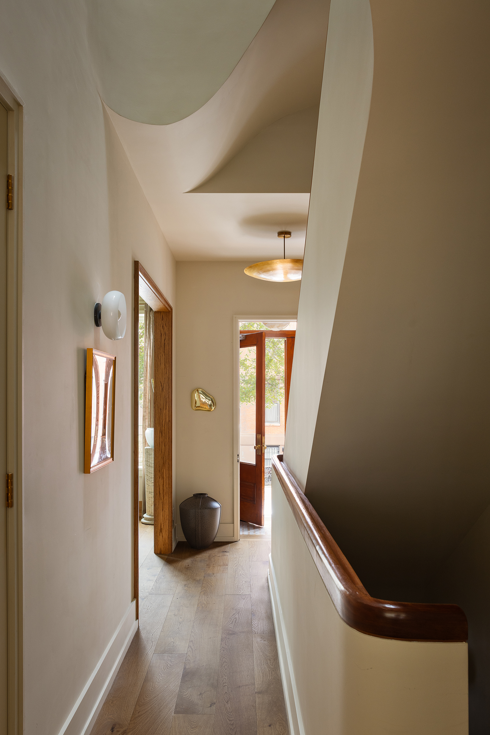 A restrained palette of materials runs throughout, defined by flat-sawn white oak floors and a mix of marble, walnut, and quartzite countertops. Custom millwork and sculptural elements add warmth, while larger architectural moves define the experience of the space. The stair serves as a central feature, anchored by a sculptural mahogany railing that connects each level.