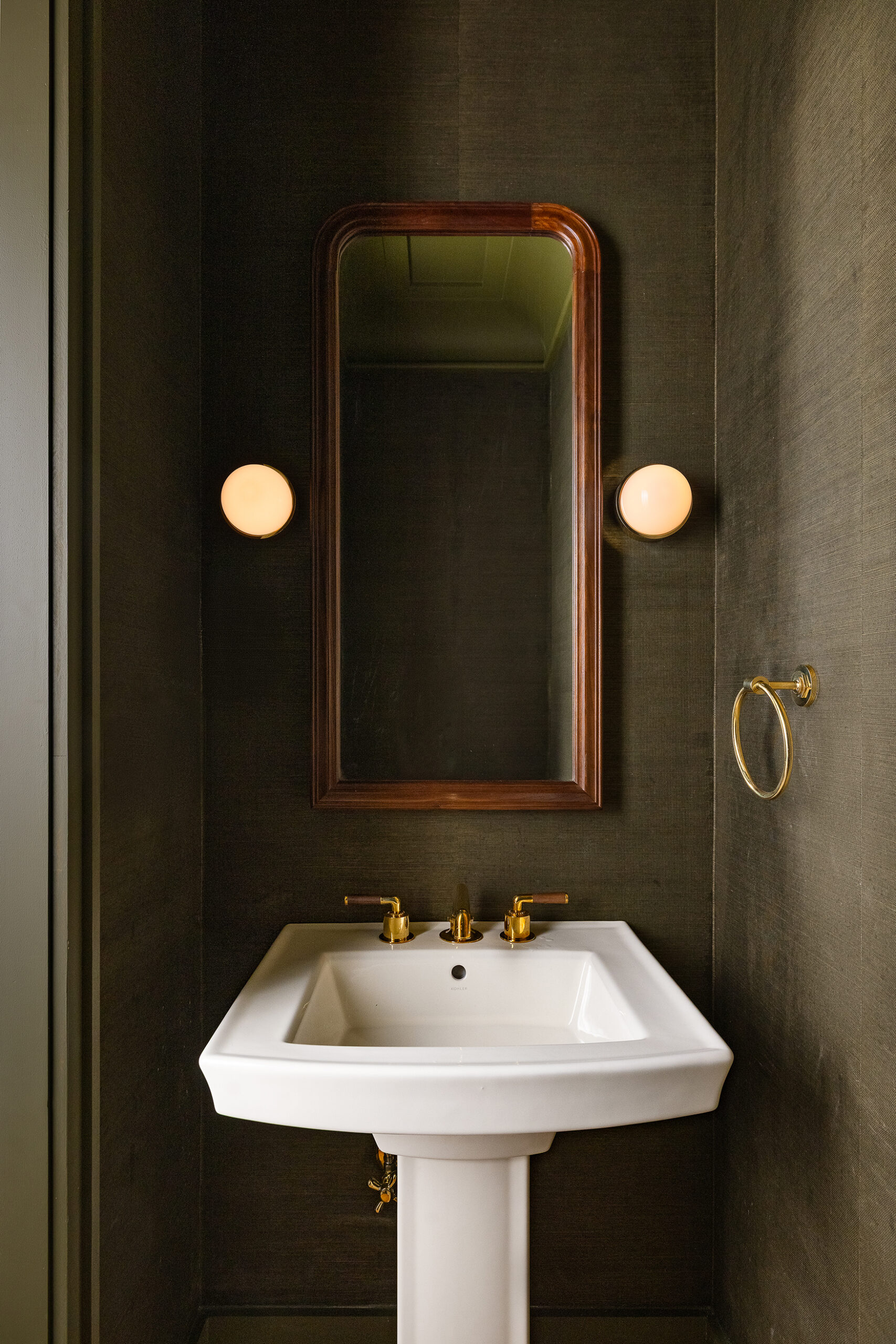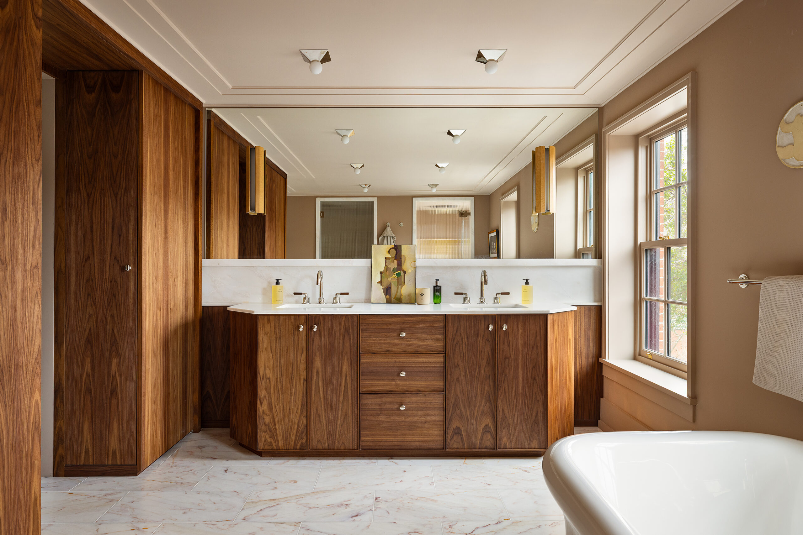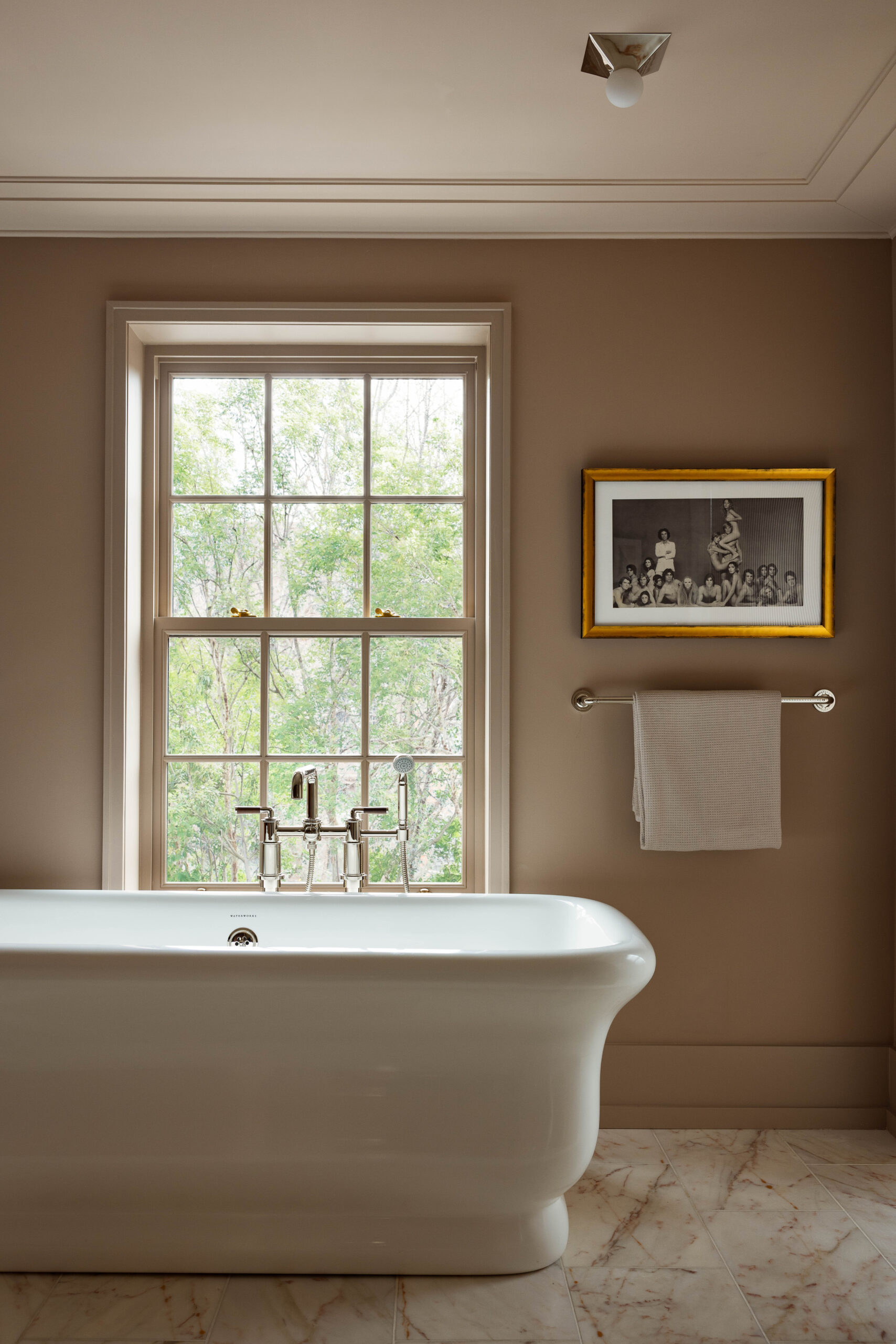 Finishes include Waterworks fixtures, bespoke cabinetry with Blum hardware, and a refined Farrow & Ball palette, complemented by limewashed walls and millwork inspired by 19th-century interiors.