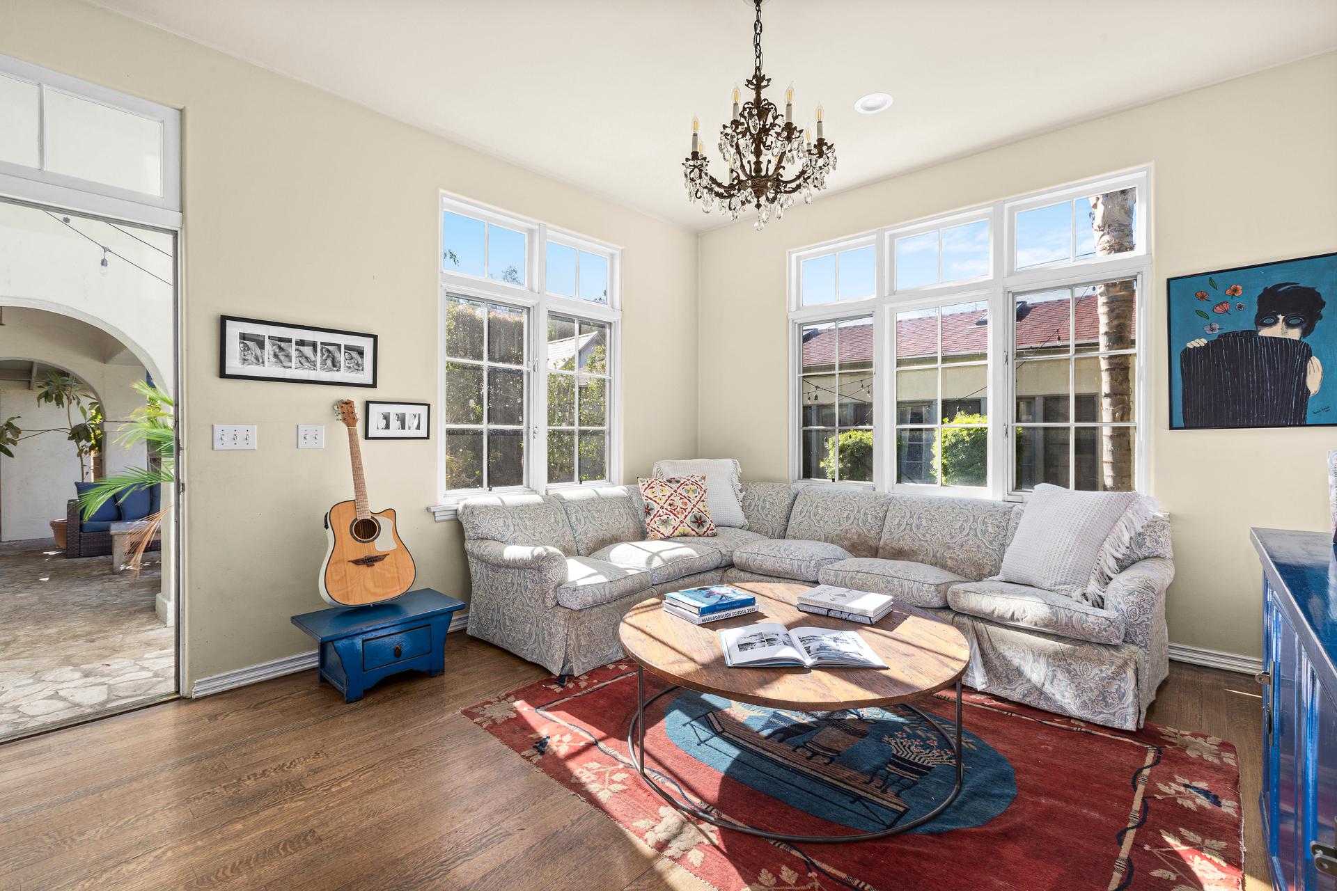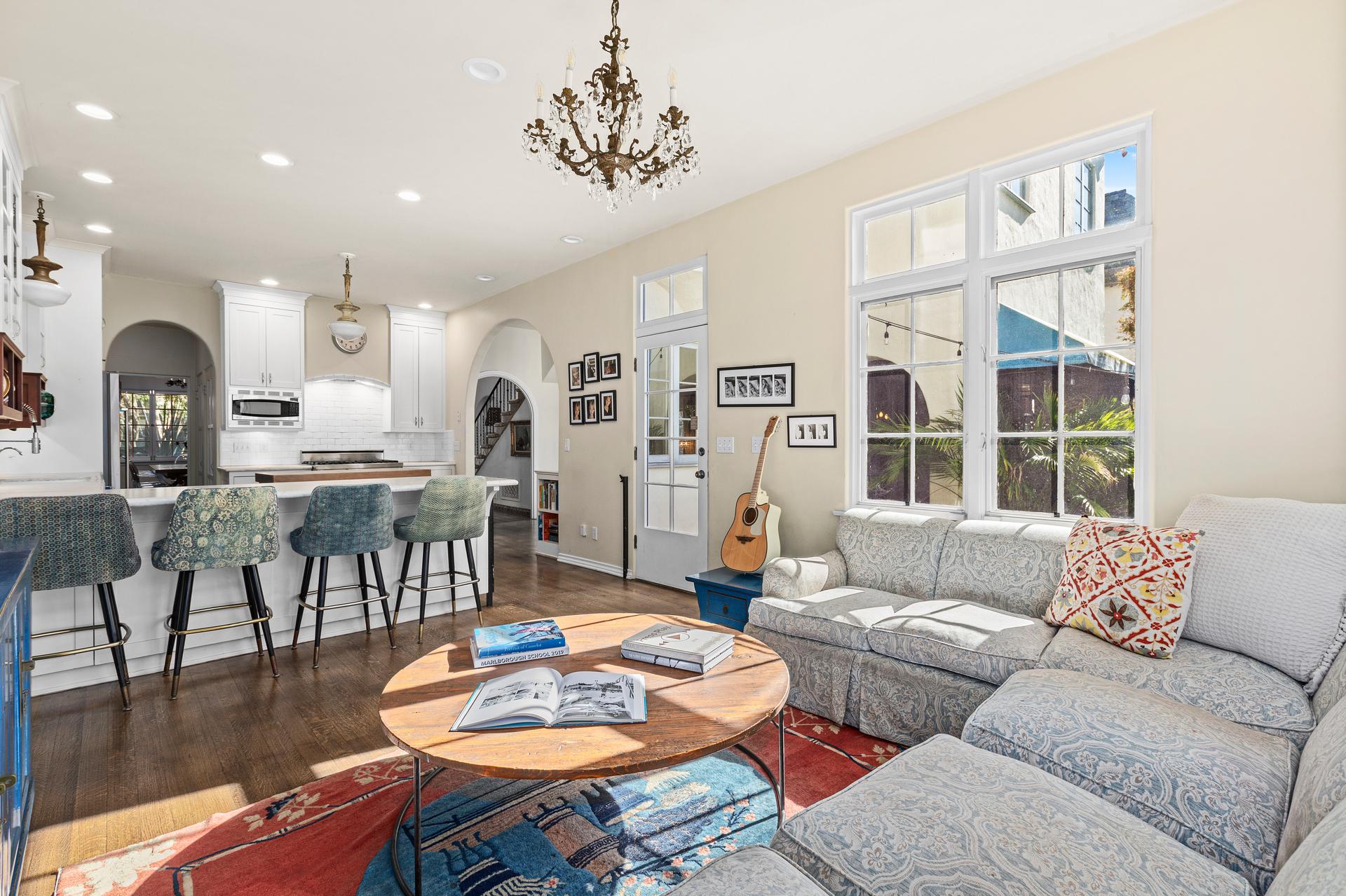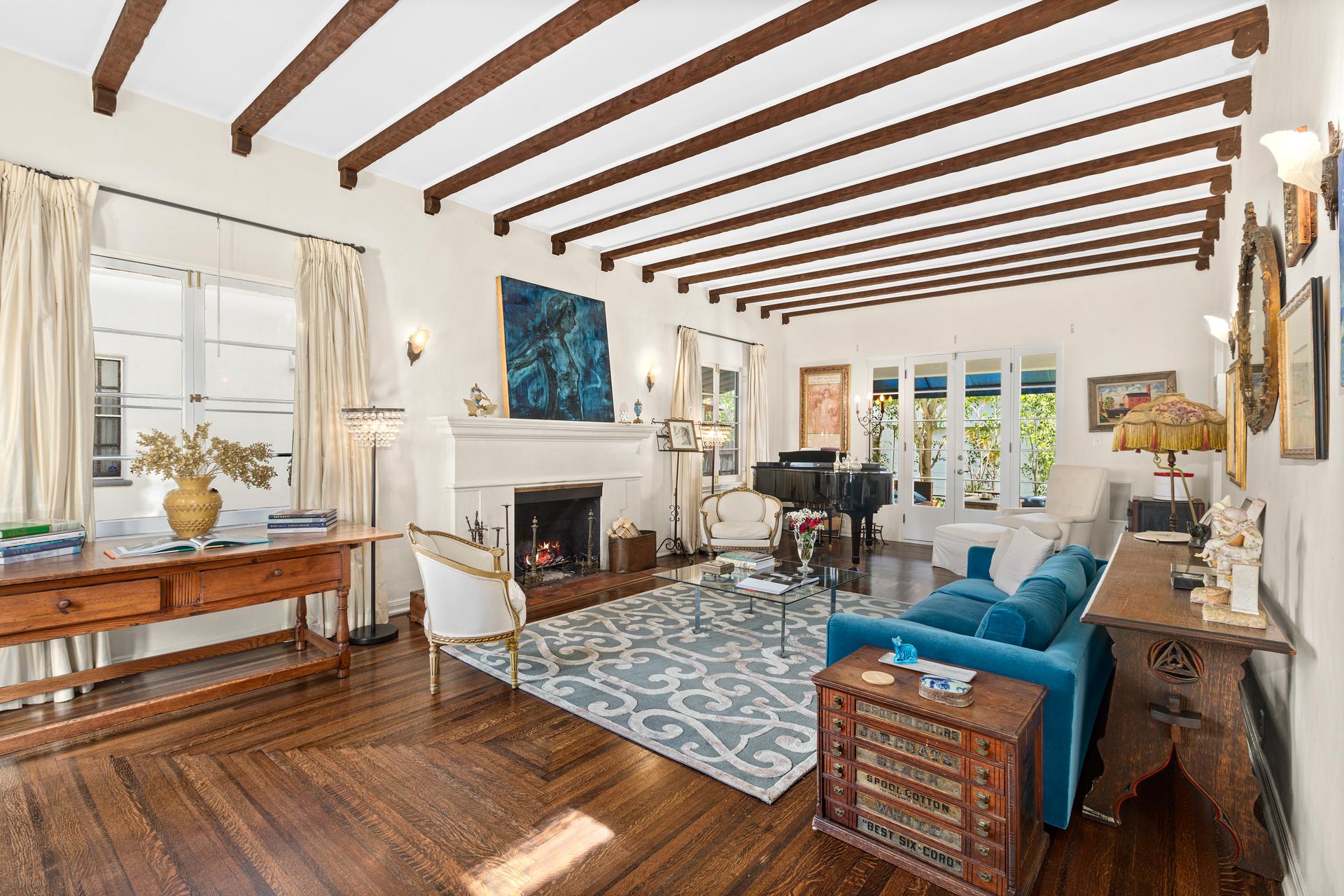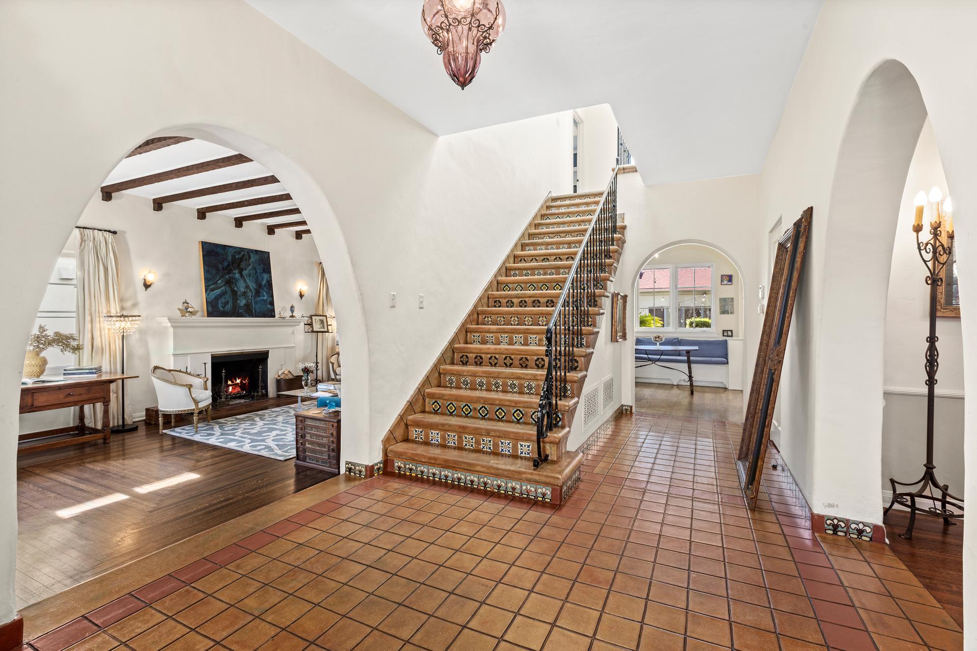 This exquisitely restored Spanish residence sits on a prime tree-lined street in Hancock Park, blending timeless 1920s architecture with refined modern touches. The home offers four bedrooms and three bathrooms in the main house, plus a separate one-bedroom, one-bathroom guest house, spanning over approximately 3,500 square feet. Inside, classic details abound, from arched passageways and richly hued hardwood floors to exposed wood beams and handcrafted tilework along the grand staircase. A gracious living room centers around a fireplace framed by original casement windows, while the chef’s kitchen opens to a sunlit family room for effortless flow. French doors lead to a private, lushly landscaped patio, a peaceful retreat perfect for relaxing or entertaining.
