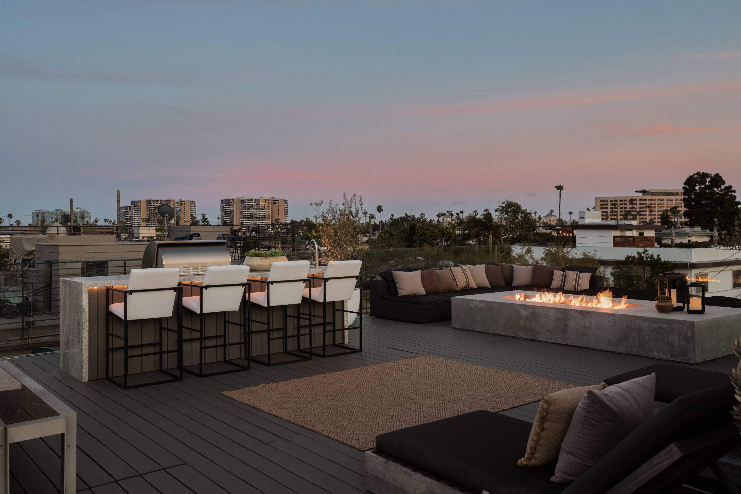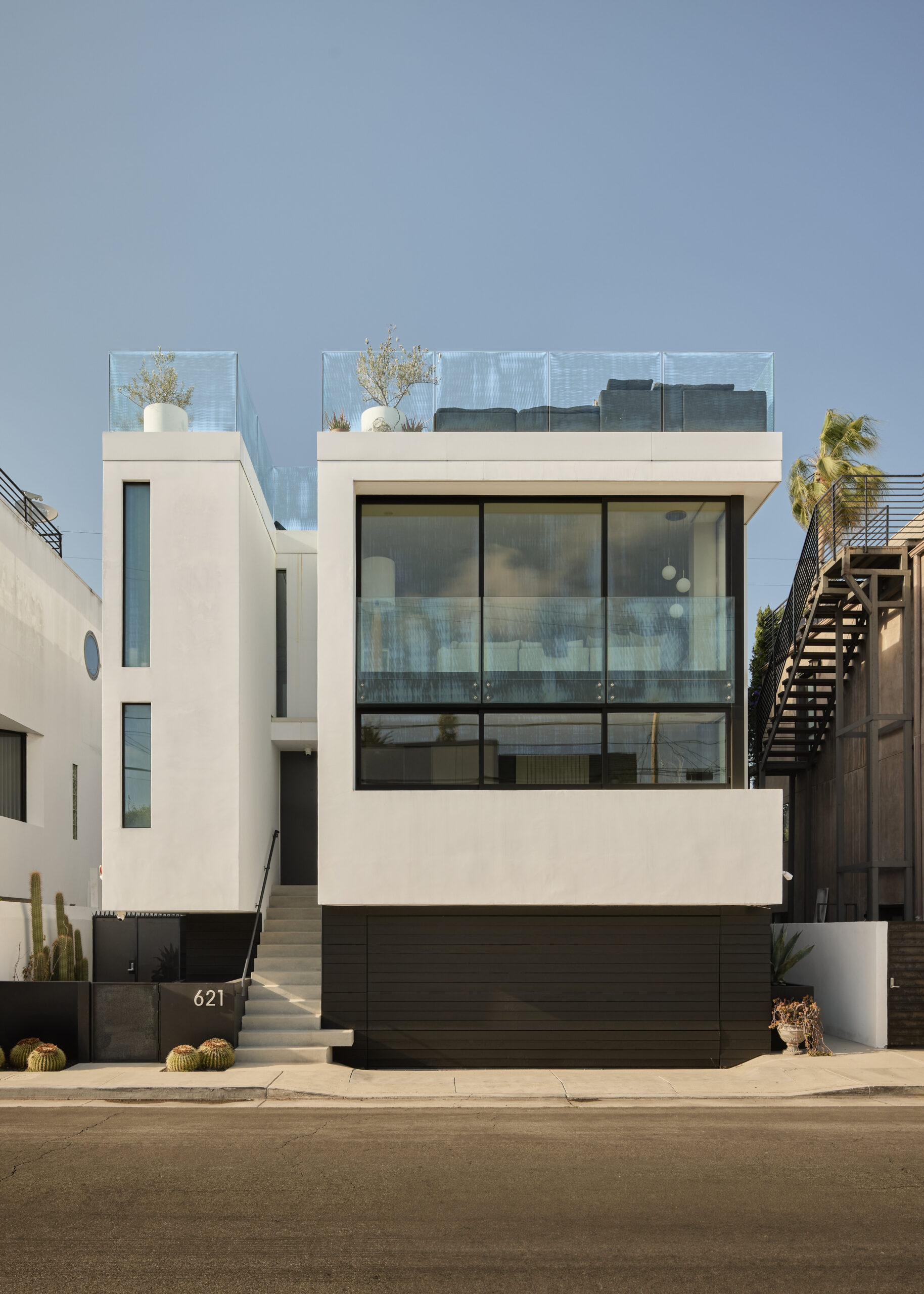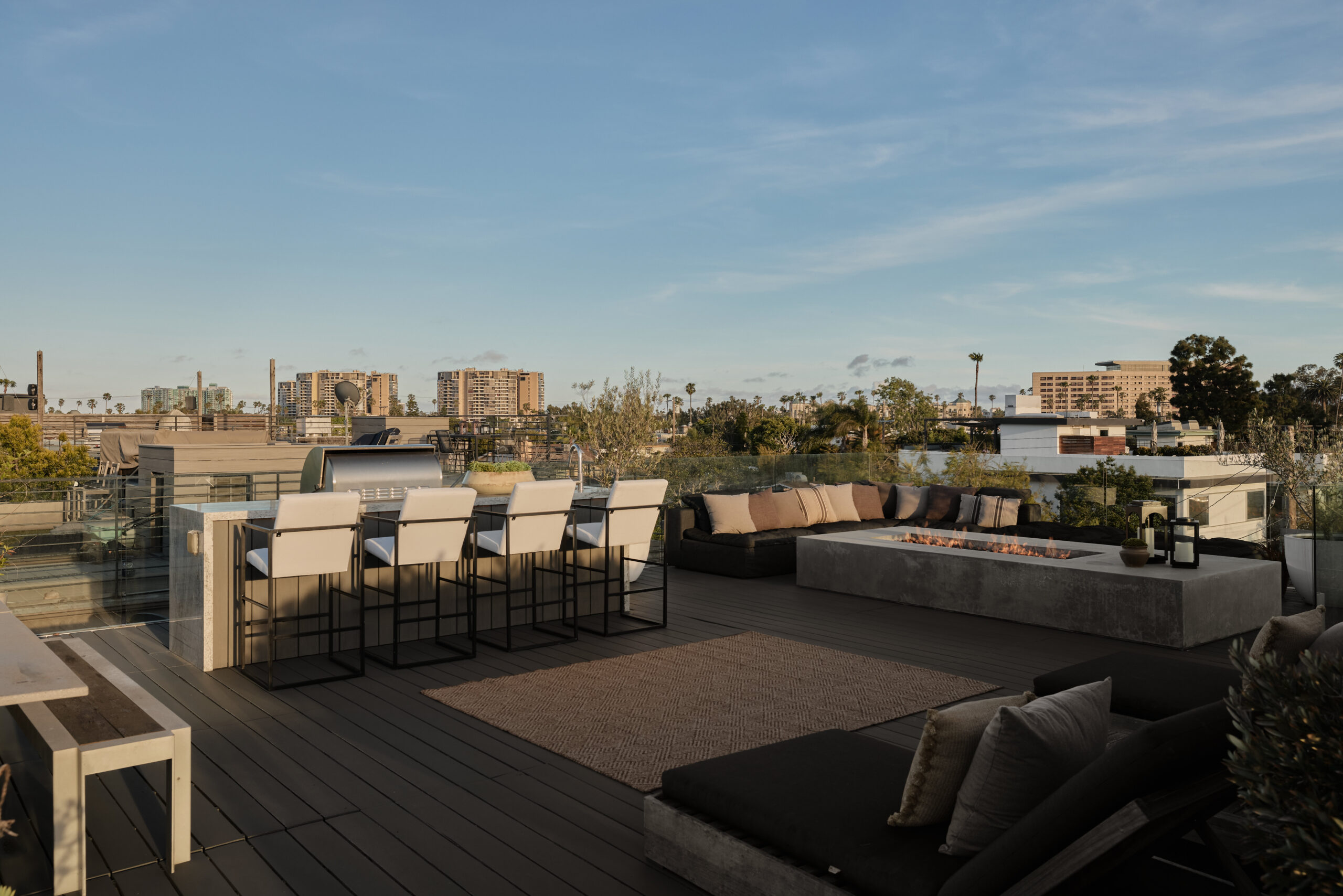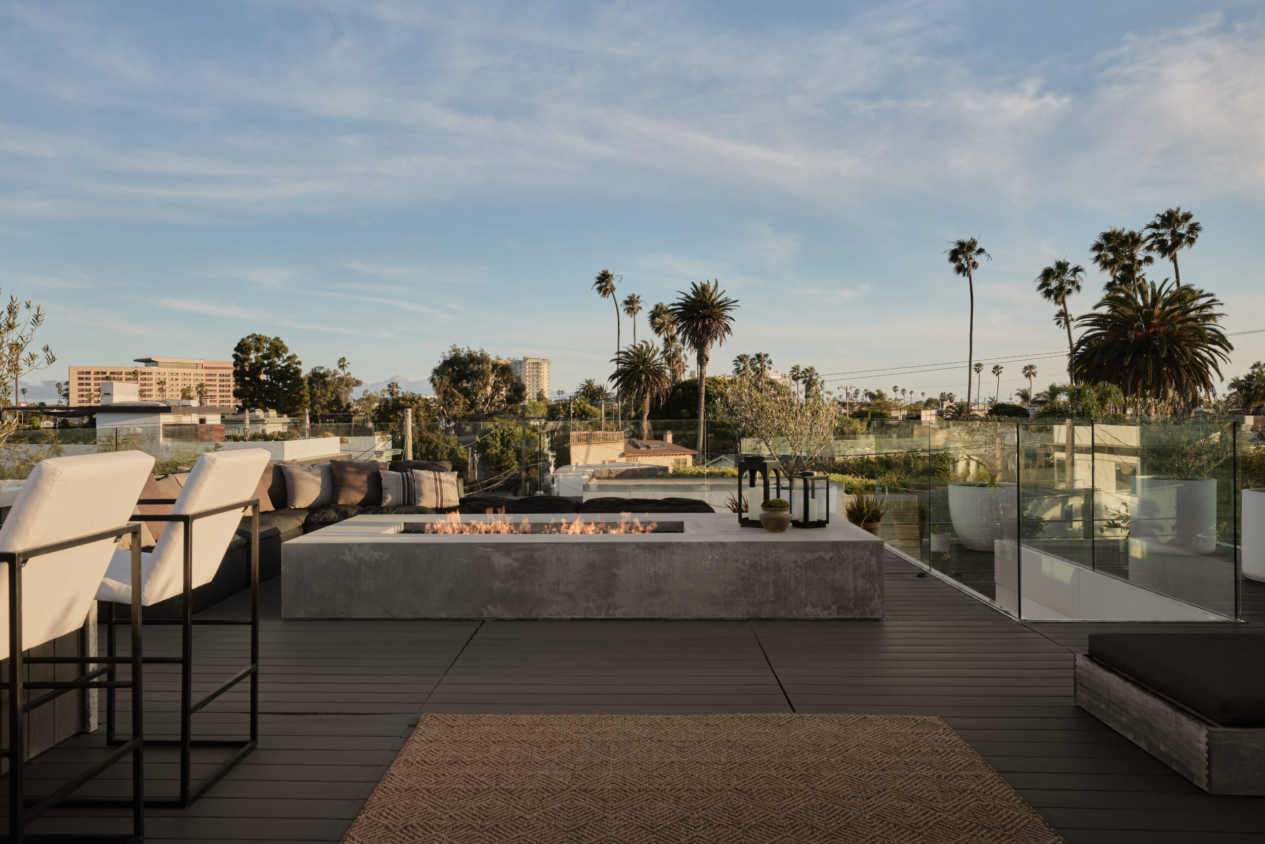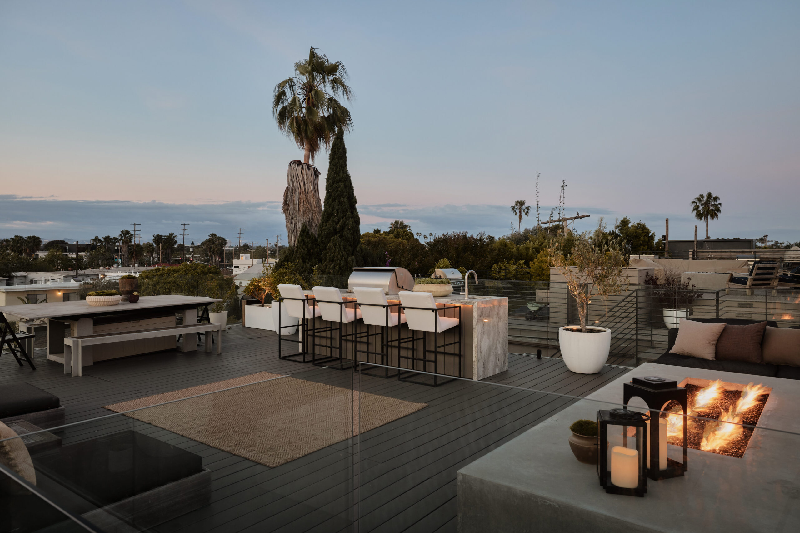 Ultra-sophisticated, this modern Venice residence showcases walls of glass, expansive living spaces, and a private rooftop deck capturing sweeping views. Spanning nearly 3,000 square feet, the three-bedroom, four-bath home offers a refined coastal lifestyle just moments from the boutiques and dining of Abbot Kinney and the beach. The main level unfolds as a bright, open-concept floor plan where floor-to-ceiling windows flood the interiors with natural light and create a seamless indoor-outdoor feel. Anchoring the dining area, a double-sided fireplace adds architectural presence, while the adjacent chef's kitchen features a sculptural island, integrated appliances, and a marble backsplash. The primary suite is a serene retreat, highlighted by a wall of glass overlooking lush greenery and a spa-like bath with a glass-enclosed shower, soaking tub, and dual-sink vanity. Designed for both elevated entertaining and relaxed everyday living, the expansive rooftop deck offers a true outdoor oasis with a built-in BBQ, lounge seating, dining area, and fire pit, perfect for hosting or enjoying intimate evenings with sweeping vistas. Thoughtfully designed throughout, this residence delivers both style and function in one of the Westside's most coveted locations.