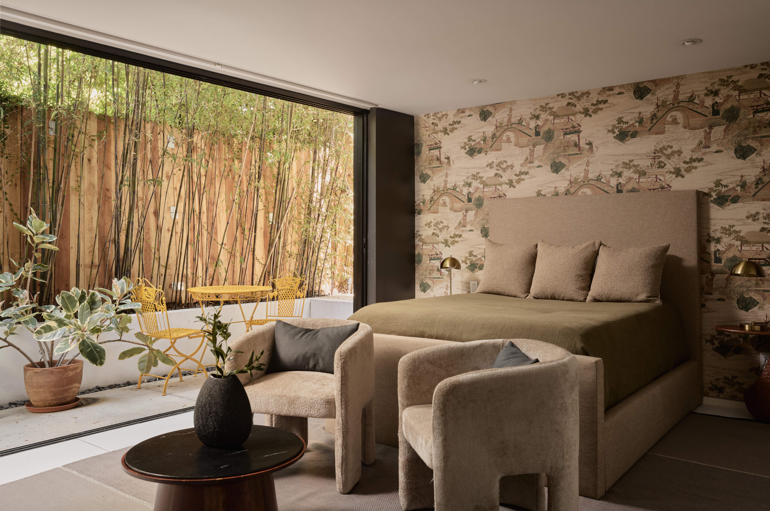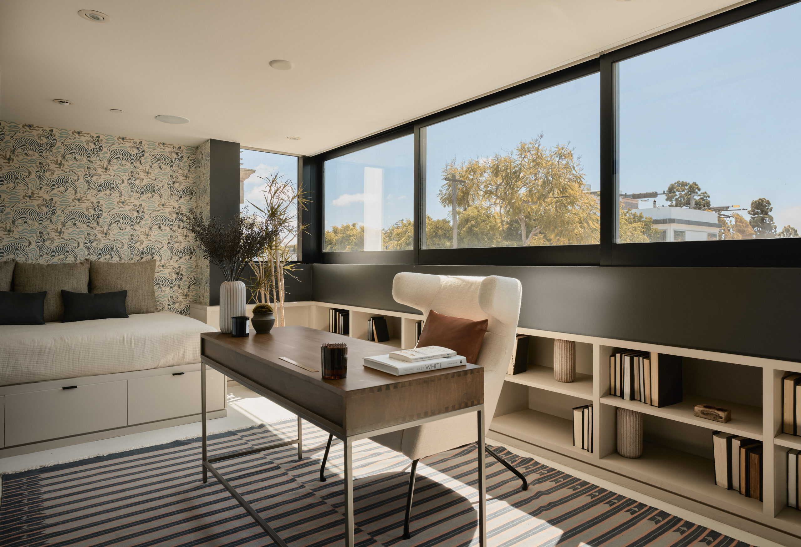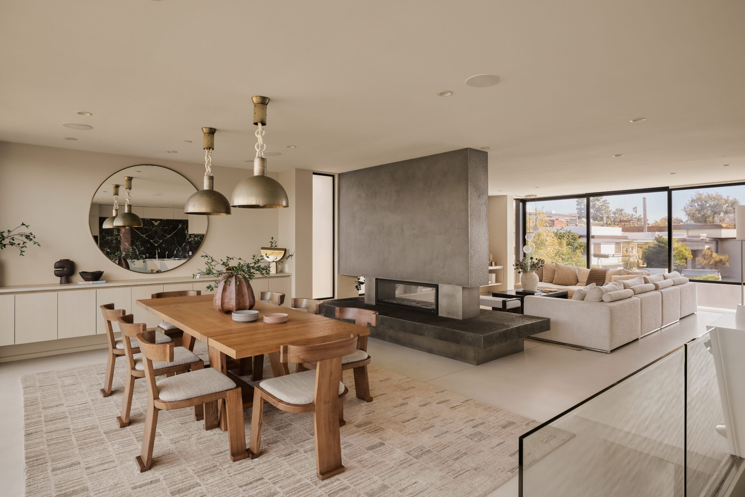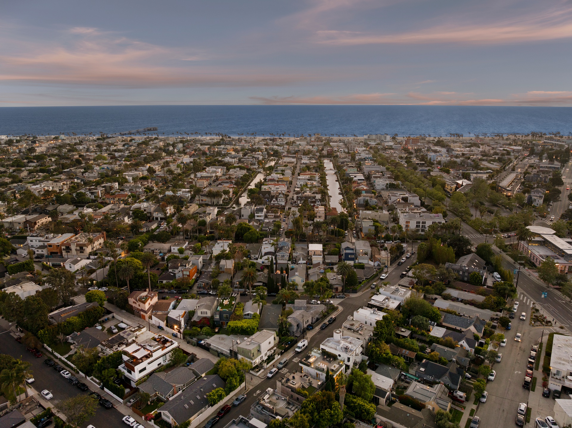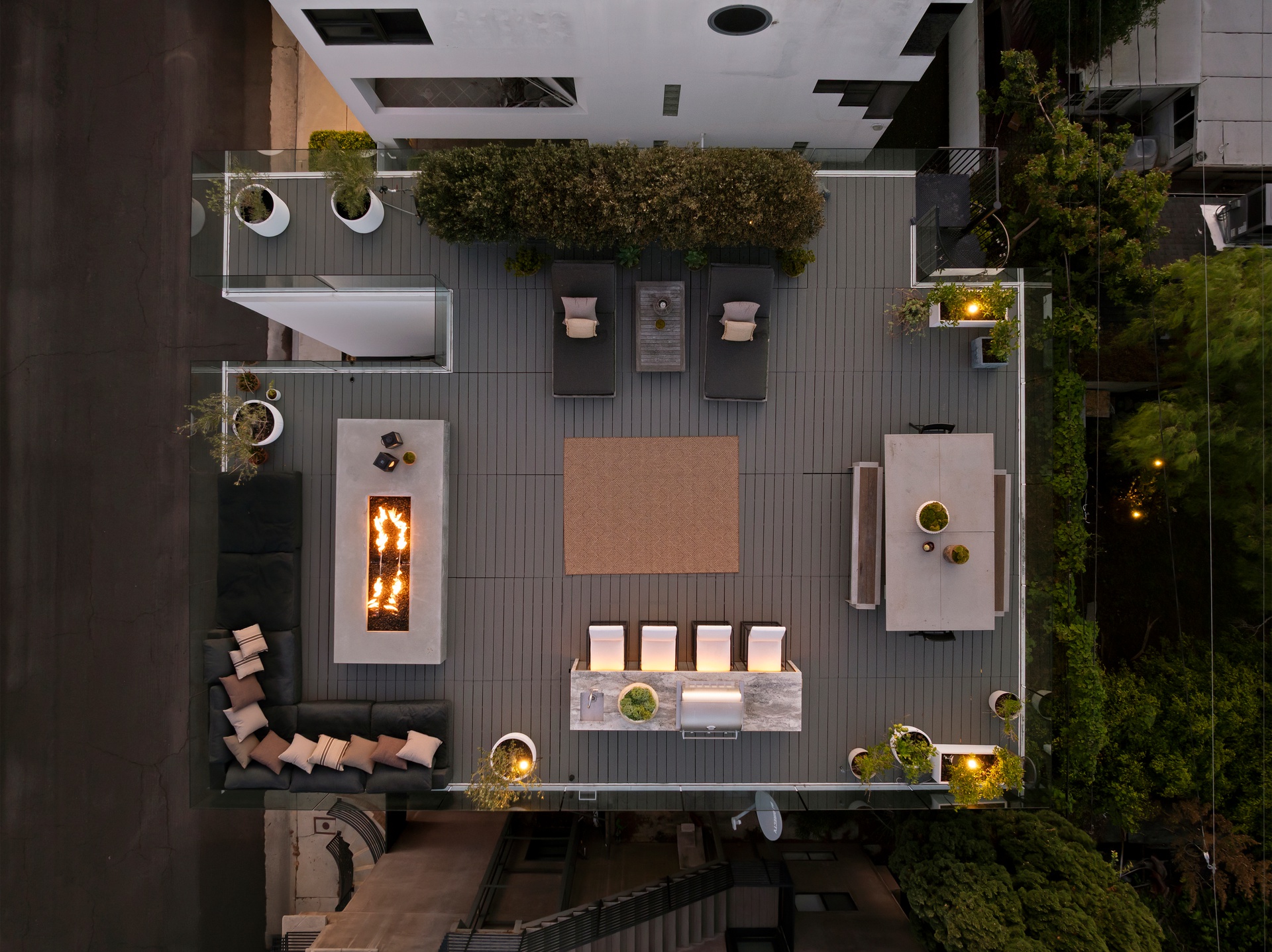 Ultra-sophisticated, this modern Venice residence showcases walls of glass, expansive living spaces, and a private rooftop deck capturing sweeping views. Spanning nearly 3,000 square feet, the three-bedroom, four-bath home offers a refined coastal lifestyle just moments from the boutiques and dining of Abbot Kinney and the beach. The main level unfolds as a bright, open-concept floor plan where floor-to-ceiling windows flood the interiors with natural light and create a seamless indoor-outdoor feel. Anchoring the dining area, a double-sided fireplace adds architectural presence, while the adjacent chef's kitchen features a sculptural island, integrated appliances, and a marble backsplash. The primary suite is a serene retreat, highlighted by a wall of glass overlooking lush greenery and a spa-like bath with a glass-enclosed shower, soaking tub, and dual-sink vanity. Designed for both elevated entertaining and relaxed everyday living, the expansive rooftop deck offers a true outdoor oasis with a built-in BBQ, lounge seating, dining area, and fire pit, perfect for hosting or enjoying intimate evenings with sweeping vistas. Thoughtfully designed throughout, this residence delivers both style and function in one of the Westside's most coveted locations.