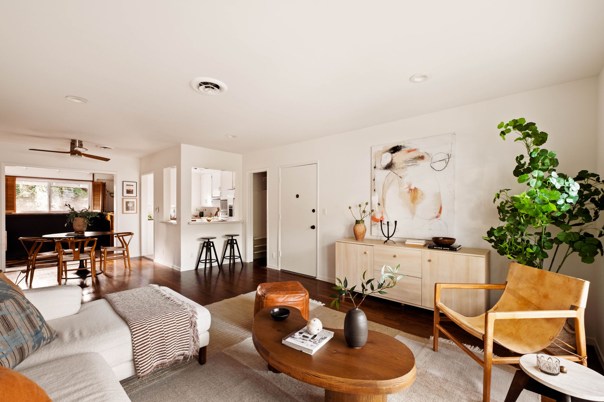 Discover classic Melrose Place vibes in this charming, fully gated Hollywood residence. This redone 1-bed, 1-bath home blends mid-century character with modern comfort and offers a bright, open main living space framed by a wall of windows overlooking treetop views. Hardwood floors run throughout, leading to a cozy den ideal for a home office or creative studio.