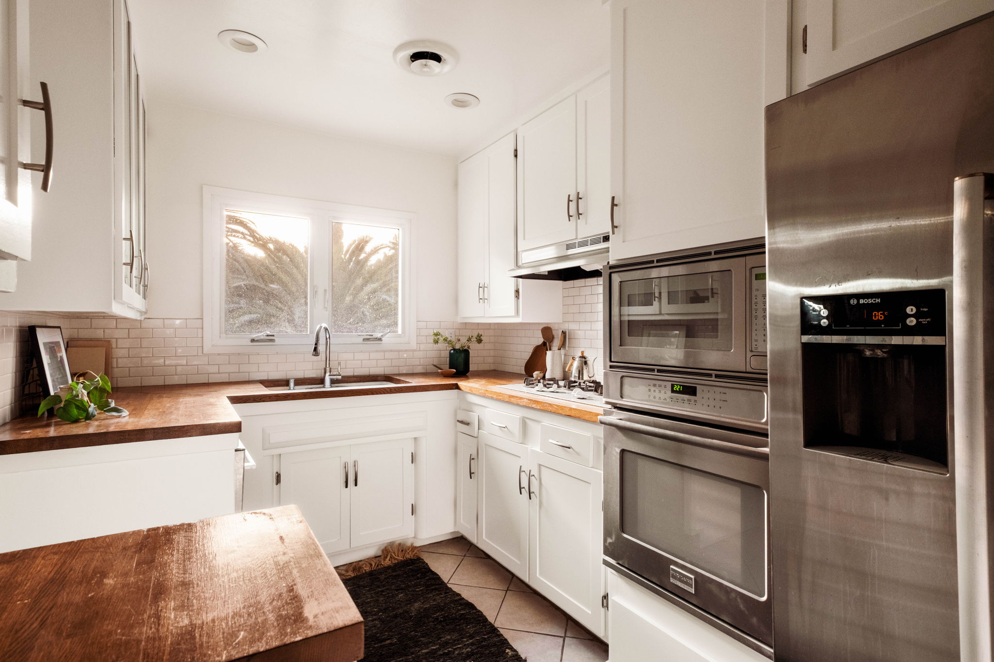 The inviting kitchen features wood countertops, white cabinetry, a breakfast bar, and stainless steel appliances, while the generous primary bedroom includes a walk-in closet and an updated bath. Additional highlights include an electric car charger and access to the resort-inspired community pool.