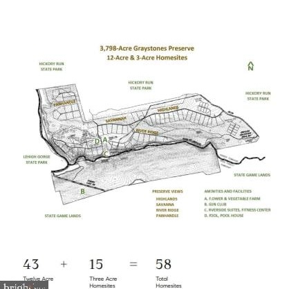 Welcome to Graystones Preserve! This first-class enclave, with a multitude of recreational options, provides an exclusive opportunity for a select group of buyers to collectively own 3,798-acres of private preserve including a personal 3 or 12-acre homesite on stunningly beautiful, peaceful property in the Mountains of Northeastern Pennsylvania. Graystones Preserve features 73 homesites (twelve-acre homesites and three-acre homesites). Twelve-acre homesites are listed between $750,000 and $975,000 and three-acre homesites run between $595,000 and $675,000; each providing privacy, view corridors, accessibility, and river or panoramic vistas. Consistent with the theme of self-reliance, each homesite will have its own well and septic. Literally surrounded by state parks, the rolling hills of this valley overlook Graystones Preserve's renowned 3.5-mile trout stream complete with waterfalls, big trout and bald eagles. These strategically positioned homesites have 25-mile, uninterrupted views. The preserve will be adding carefully planned amenities and services to create a connected experience while also featuring privacy. Once an initial group of homesites are purchased, Preservation Graystones LLC will transfer ownership of the entire preserve to a new Preserve Owners LLC. The new LLC will own all of the common areas of the preserve (the entire preserve with the exception of the homesites) and construction will begin on amenities and infrastructure. The Preserve offers a unique combination of privacy, luxury, and accessibility where owners will enjoy a range of activities, carefully designed amenities, and the opportunity to simply relax amidst the sights and sounds of nature. Amenities will include: 9 master suites, A lodge with a great room and entertainment kitchen, Game room, New Dock, Swimming pool with 25-Mile View, Tended Organic Vegetable and Flower Gardens, 200-Acre Open Meadow, Gun club (including skeet, trap, and sporting clays), Fitness facility, and a Fly-tying room. An array of services including maintenance, cleaning, grocery delivery, and local chefs available to owners. Easy access around the preserve via walking, hiking, biking, and ATVs. Robust Internet access for all suites and homes. Only an hour and a half drive from Philadelphia and two hours from New York City makes an easy meeting place to connect with like-minded nature lovers and a central place to gather with
